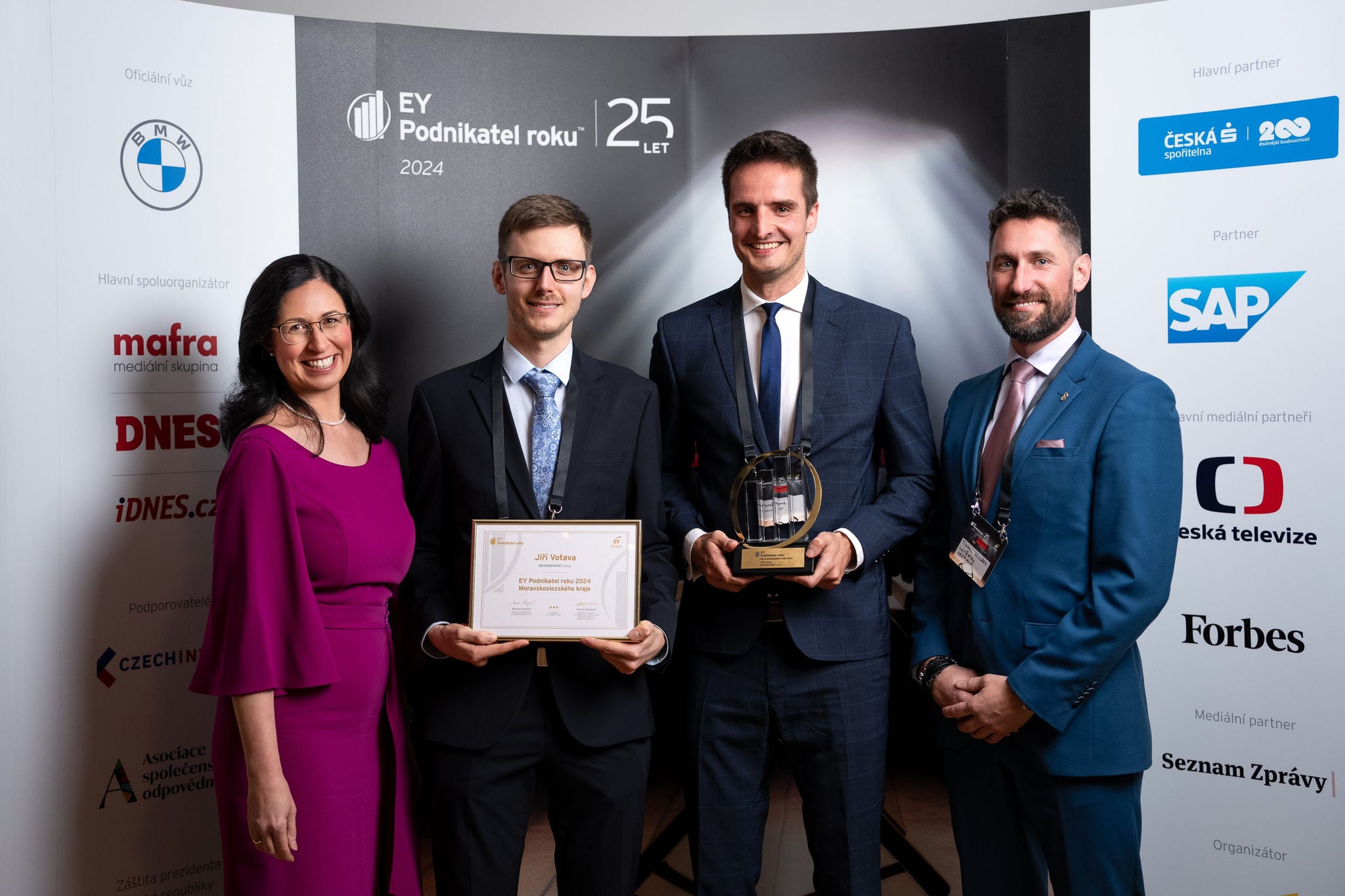 Soutěž EY Podnikatel roku 2024 Moravskoslezského kraje: Martina Kneiflová, vedoucí partnerka EY Česká republika (vlevo); (uprostřed) Marek Tomíček, manažer rozvoje společnosti BRAINMARKET a Tomáš Černý, finanční ředitel společnosti BRAINMARKET, kteří převzali cenu za nepřítomného EY Podnikatele roku 2024 Moravskoslezského kraje, zakladatele BRAINMARKET Jiřího Votavu; Michal Kokošek náměstek hejtmana Moravskoslezského kraje (vpravo).
