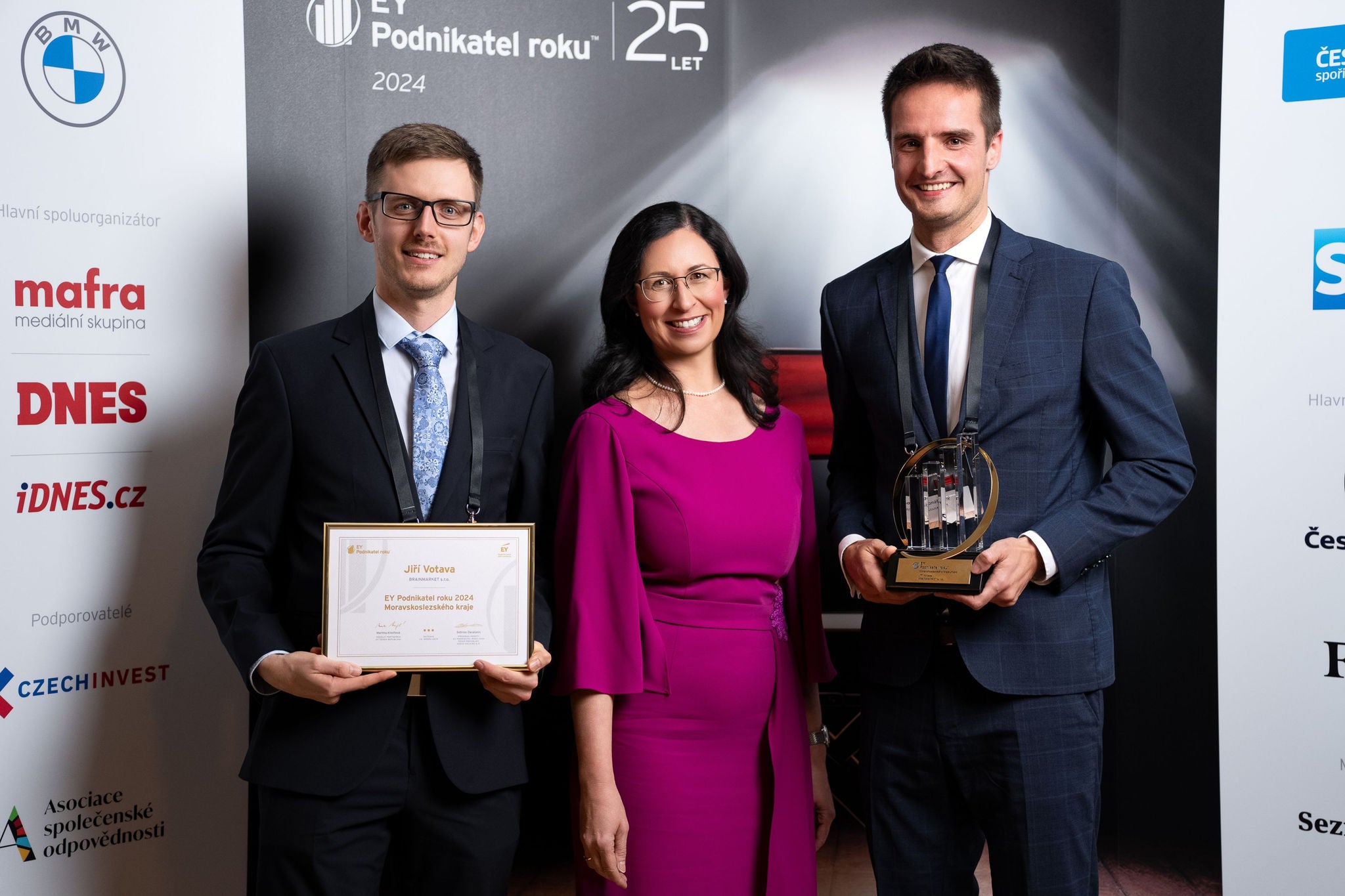 Soutěž EY Podnikatel roku 2024 Moravskoslezského kraje: Cenu pro Jiřího Votavu, zakladatele společnosti BRAINMARKET a držitele titulu EY Podnikatel roku 2024 Moravskoslezského kraje, převzali jeho spolupracovníci, zleva Marek Tomíček, manažer rozvoje společnosti BRAINMARKET a Tomáš Černý, finanční ředitel společnosti BRAINMARKET.