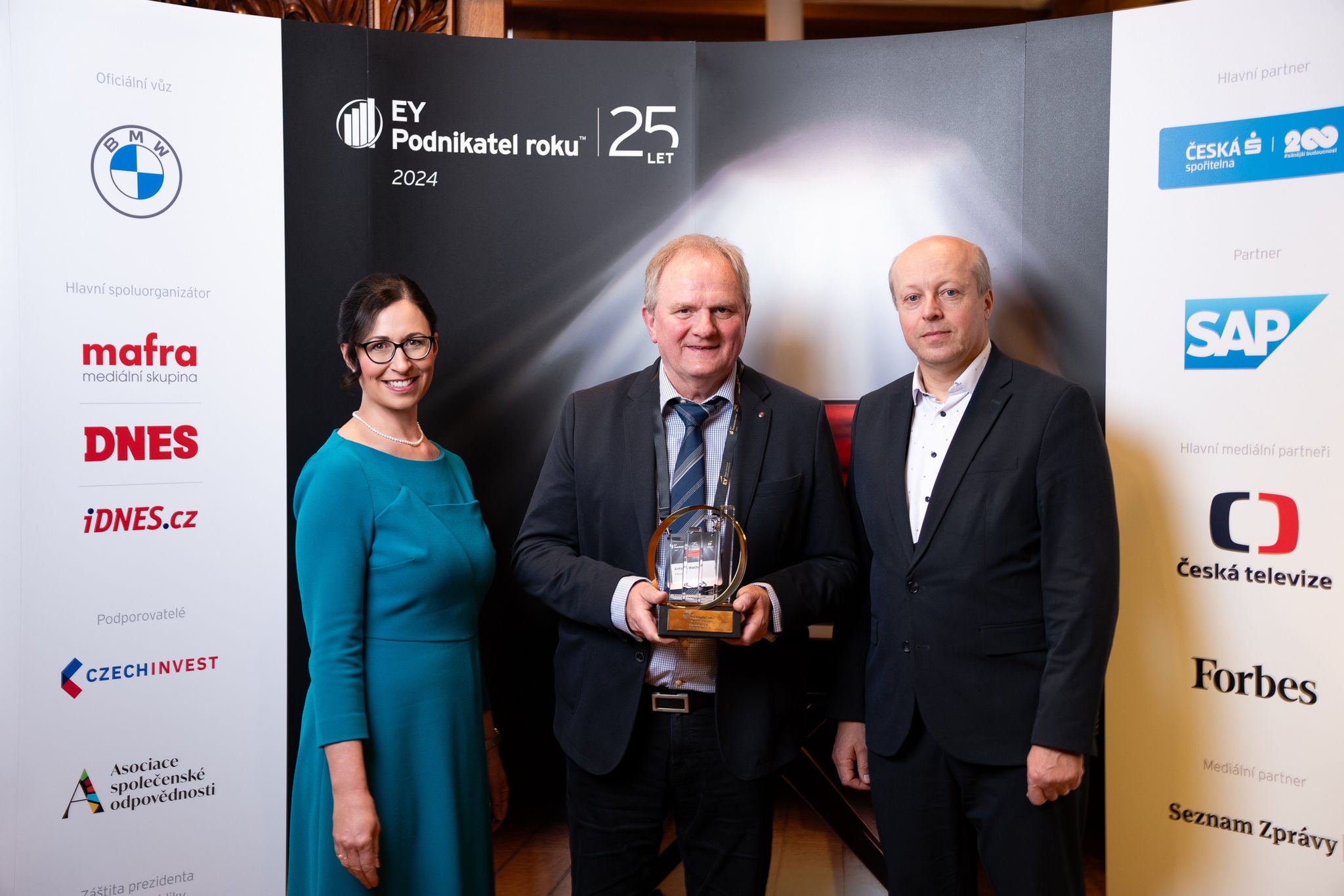 Soutěž EY Podnikatel roku 2024 Zlínského kraje, zleva: Martina Kneiflová, vedoucí partnerka EY Česká republika; Antonín Machala, zakladatel a jednatel společnosti ALTECH a držitel titulu EY Podnikatel roku 2024 Zlínského kraje; Radek Doležel, statutární náměstek hejtmana pro dopravu Zlínského kraje