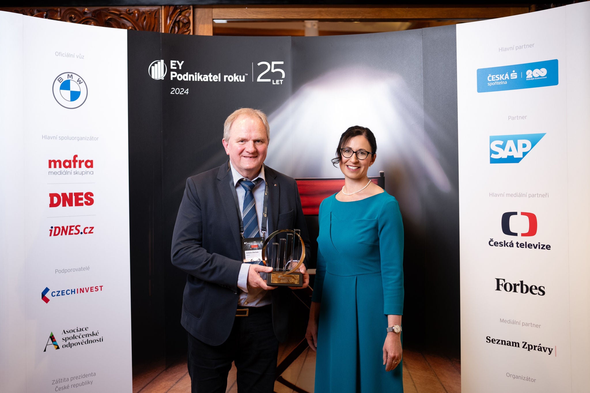 Soutěž EY Podnikatel roku 2024 Zlínského kraje, zleva: Antonín Machala, zakladatel a jednatel společnosti ALTECH a držitel titulu EY Podnikatel roku 2024 Zlínského kraje; Martina Kneiflová, vedoucí partnerka EY Česká republika
