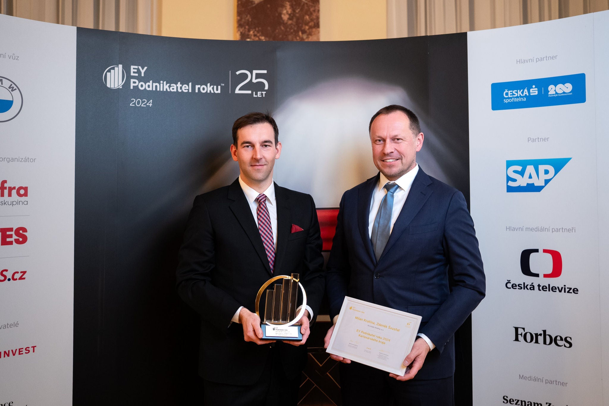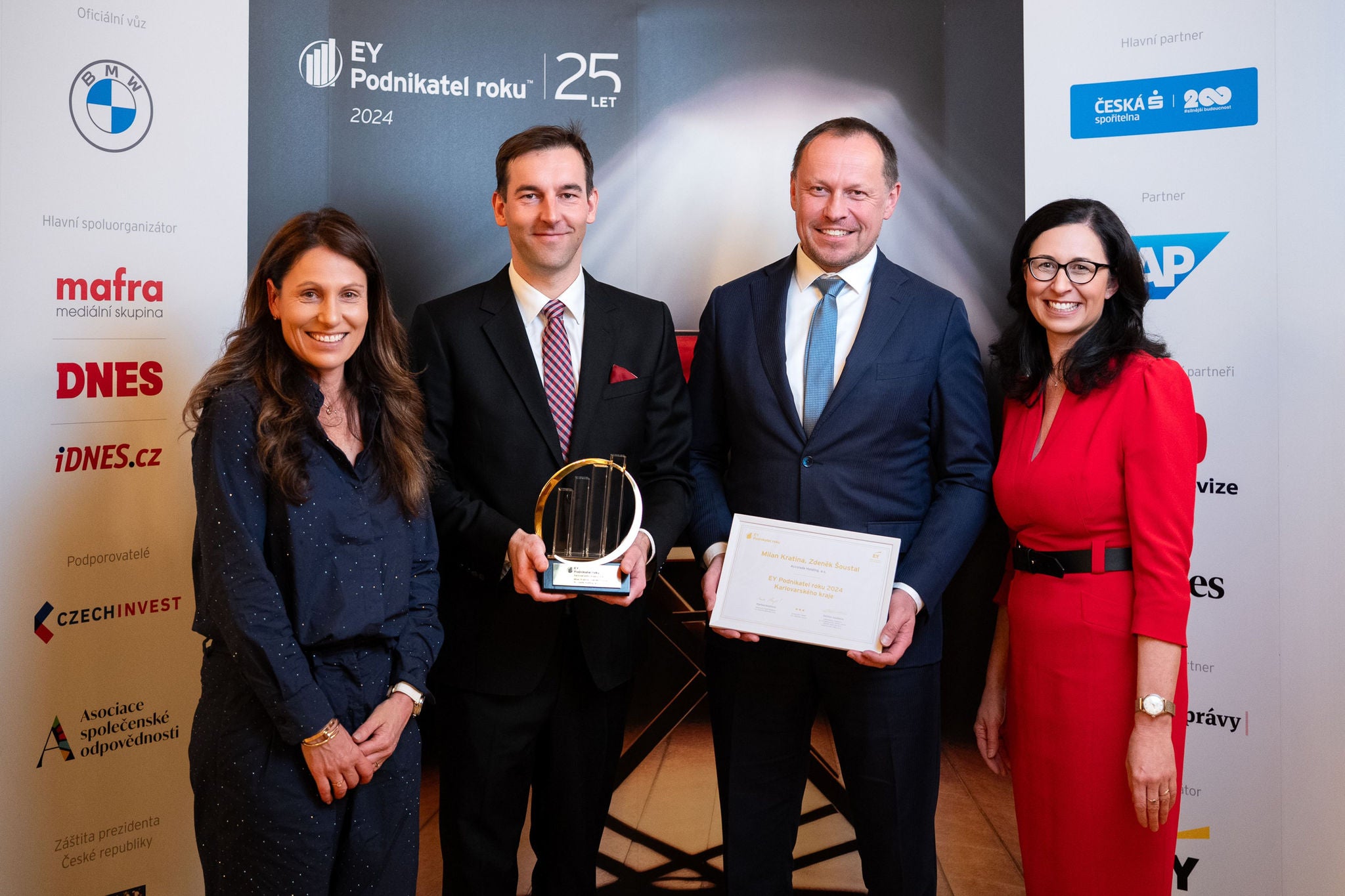 Karlovy Vary 26. února 2025 – Společnost EY oznámila vítěze letošního ročníku soutěže EY Podnikatel roku 2024 Karlovarského kraje. Ocenění putuje do rukou Milana Kratiny a Zdeňka Šoustala z Accolade Holding, a.s. Společnost založená v roce 2011 patří mezi přední hráče v oblasti průmyslových a logistických parků působících dnes na deseti evropských trzích s portfoliem zahrnujícím rozlohu 3,5 milionu m². Slavnostní vyhlášení výsledků předposledního regionálního kola soutěže proběhlo pod záštitou hejtmanky Karlovarského kraje Jany Mračkové Vildumetzové a za účasti Andrey Pfeffer Ferklové, primátorky města Karlovy Vary a členky Rady Karlovarského kraje. Záštitu letošnímu ročníku soutěže udělil prezident České republiky Petr Pavel.