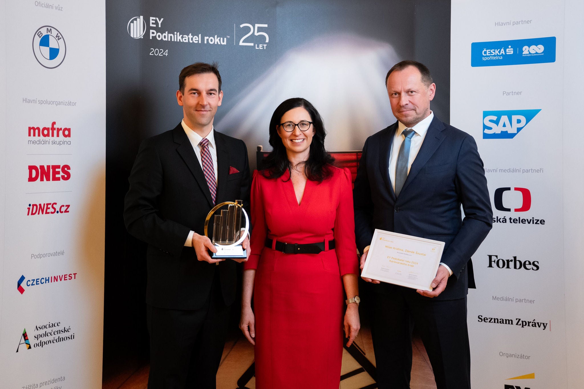 Soutěž EY Podnikatel roku 2024 Karlovarského kraje, zleva: Milan Kratina, spolumajitel společnosti Accolade a držitel titulu EY Podnikatel roku 2024 Karlovarského kraje; Martina Kneiflová, vedoucí partnerka EY Česká republika; Zdeněk Šoustal, spolumajitel společnosti Accolade a držitel titulu EY Podnikatel roku 2024 Karlovarského kraje