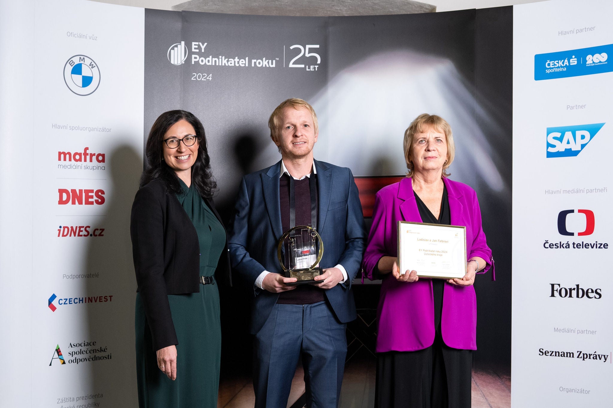 Soutěž EY Podnikatel roku 2024 Ústeckého kraje, zleva: Martina Kneiflová, vedoucí partnerka EY Česká republika, Ladislav Falbr, spolumajitel JLF Group a držitel titulu EY Podnikatel roku 2024 Ústeckého kraje; Ladislava Falbrová, členka dozorčí rady JLF Group a matka bratrů Ladislava a Jana Falbrových