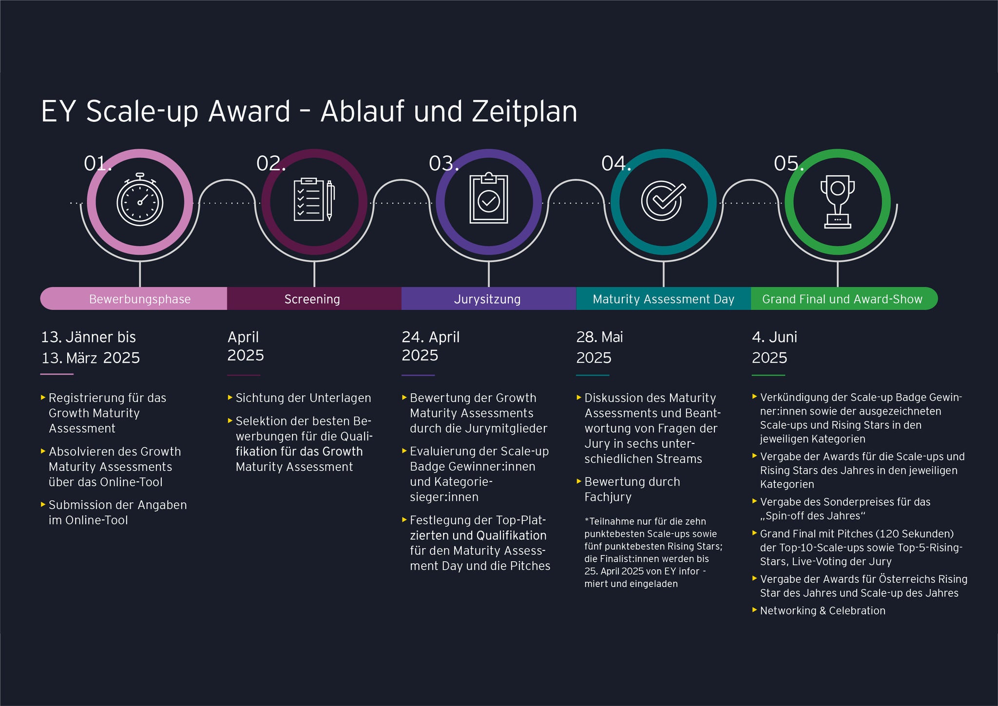 Ein umfassendes Programm unterstützt die Scale-ups und Rising Stars bei ihrer Ambition „Höher hinaus“. Der Bewerbungsprozess des anspruchsvollsten Start-up-Awards Österreichs fordert und fördert Jungunternehmen auf Wachstumskurs. Im Rahmen des mehrstufigen Bewerbungsprozesses unterstützt sie das EY Growth Maturity Assessment dabei, Optimierungspotenziale für den nächsten Wachstumsschritt zu erkennen und zu realisieren.