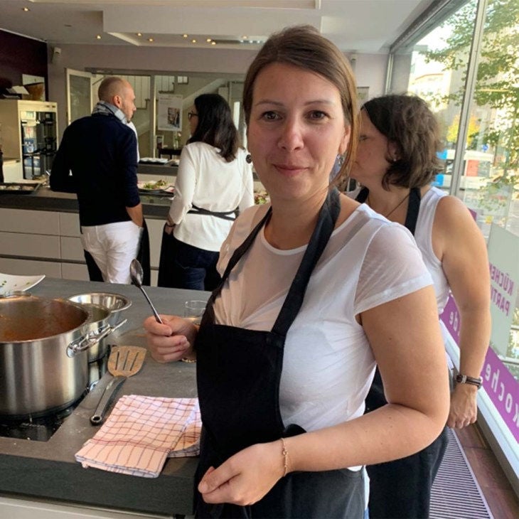 Person kocht in einer geselligen Atmosphäre mit anderen.