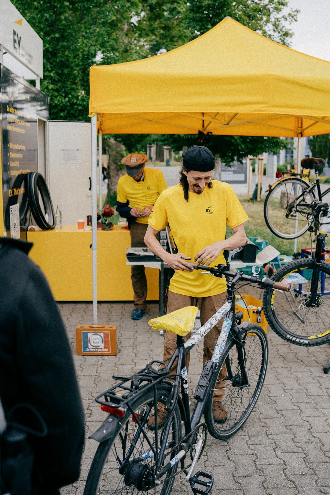 Wo Studierende sind, da sind auch Fahrräder meist nicht weit. Immerhin gehört das Zweirad zu ihren beliebtesten Fortbewegungsmitteln. Leider ist die Luft nicht nur in der Lernphase mal raus, sondern auch bei den Reifen. Damit die Studierenden auch weiterhin sicher und nachhaltig unterwegs sein können, haben wir im Rahmen unserer Roadshow getreu unserem Motto „Skills on Wheels“ eine kostenlose Fahrradreparatur angeboten. Ob gerissene Ketten, platte Reifen oder kaputte Beleuchtung – unsere beiden Fahrradmechaniker haben sich jedes noch so kleinen Defekts angenommen. Während der Wartezeit nutzten die Studierenden die Chance, sich am EY-Cube mit unseren EY-Kolleg:innen auszutauschen.