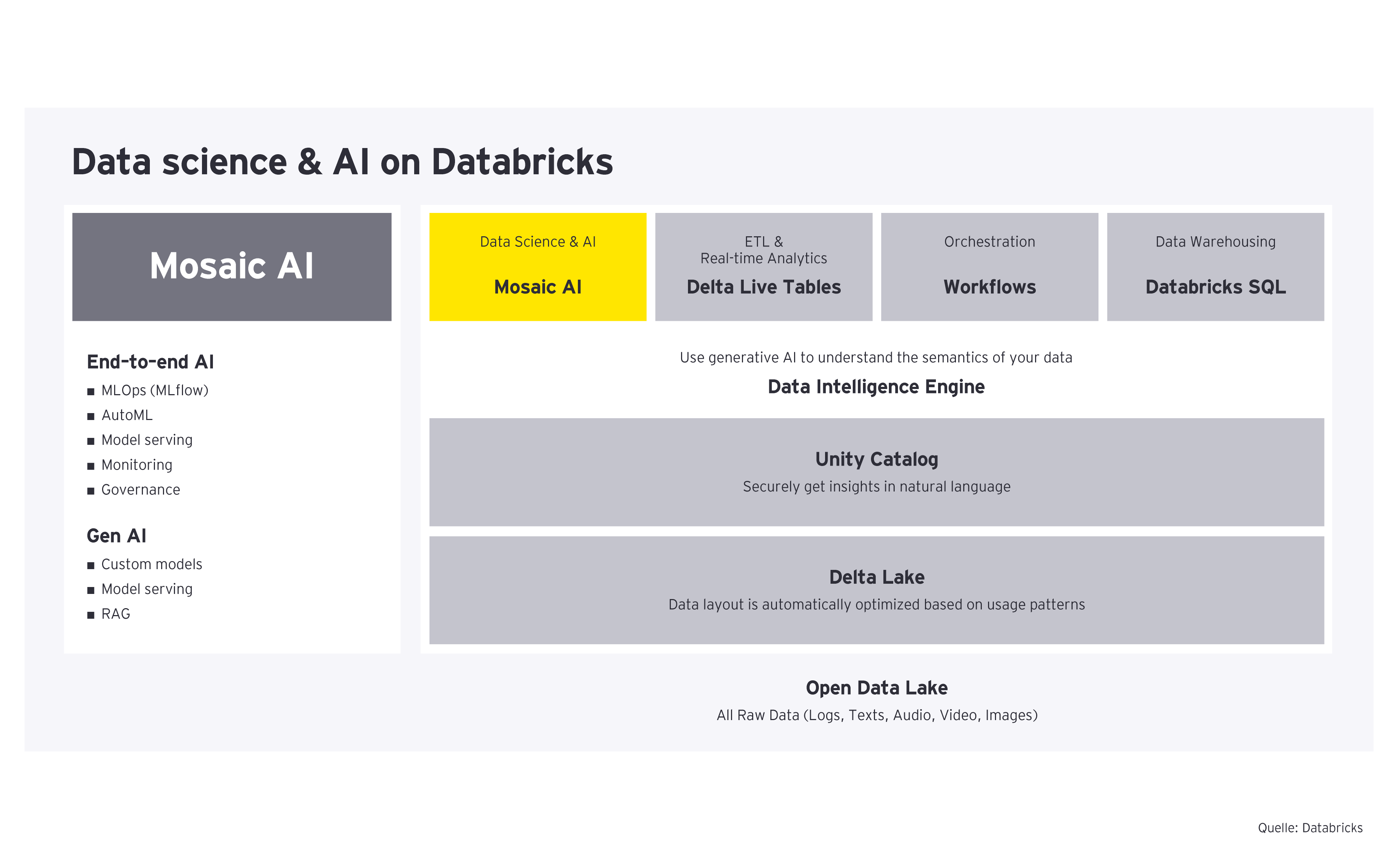 Zusätzlich unterstützen Databricks-Notebooks und Mosaic AI die agile Entwicklung und Umsetzung von KI- und GenAI-Lösungen innerhalb einer sicheren, skalierbaren und transparenten Umgebung. Automatisierte Workflows und Machine Learning Operations (MLOps) optimieren den Entwicklungsprozess weiter.