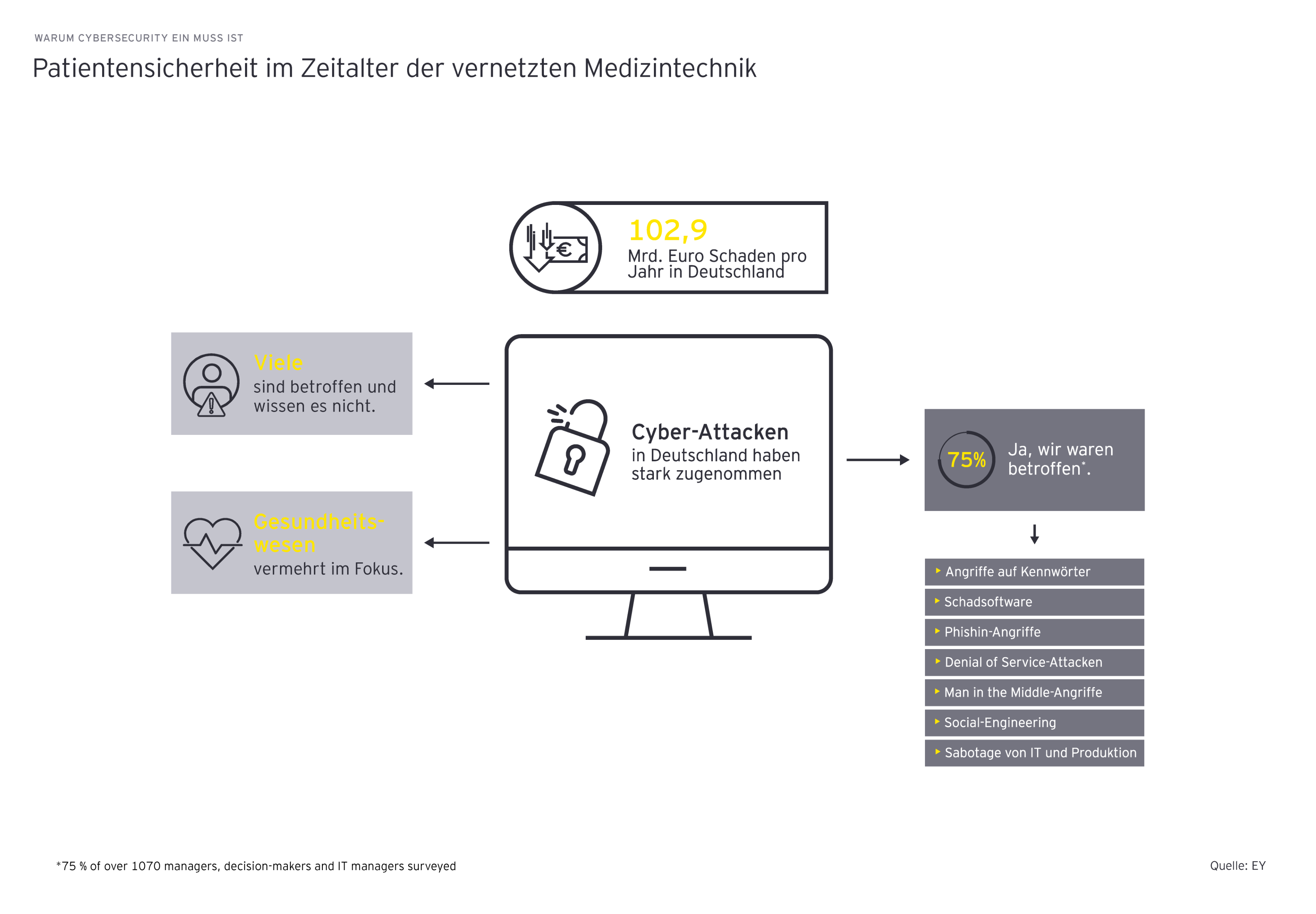 Krankenhäuser, Arztpraxen, Rettungsdienste, Labore, Arzneimittelbehörden, Pharmaunternehmen, Universitäten oder Hersteller von Medizinprodukten – ein Cyberangriff kann jede Organisation treffen, wie Vorfälle der jüngsten Vergangenheit zeigen. Dabei sind die Motive der Kriminellen so verschieden wie ihre Methoden. Lösegelderpressung, Identitätsdiebstahl, Aktivisten, die ihrem Anliegen Gehör verschaffen wollen, aber auch Cyberspionage und gezielte – häufig staatlich geförderte – Angriffe auf kritische Infrastrukturen (KRITIS), um die Bevölkerung zu verunsichern, spielen eine Rolle.