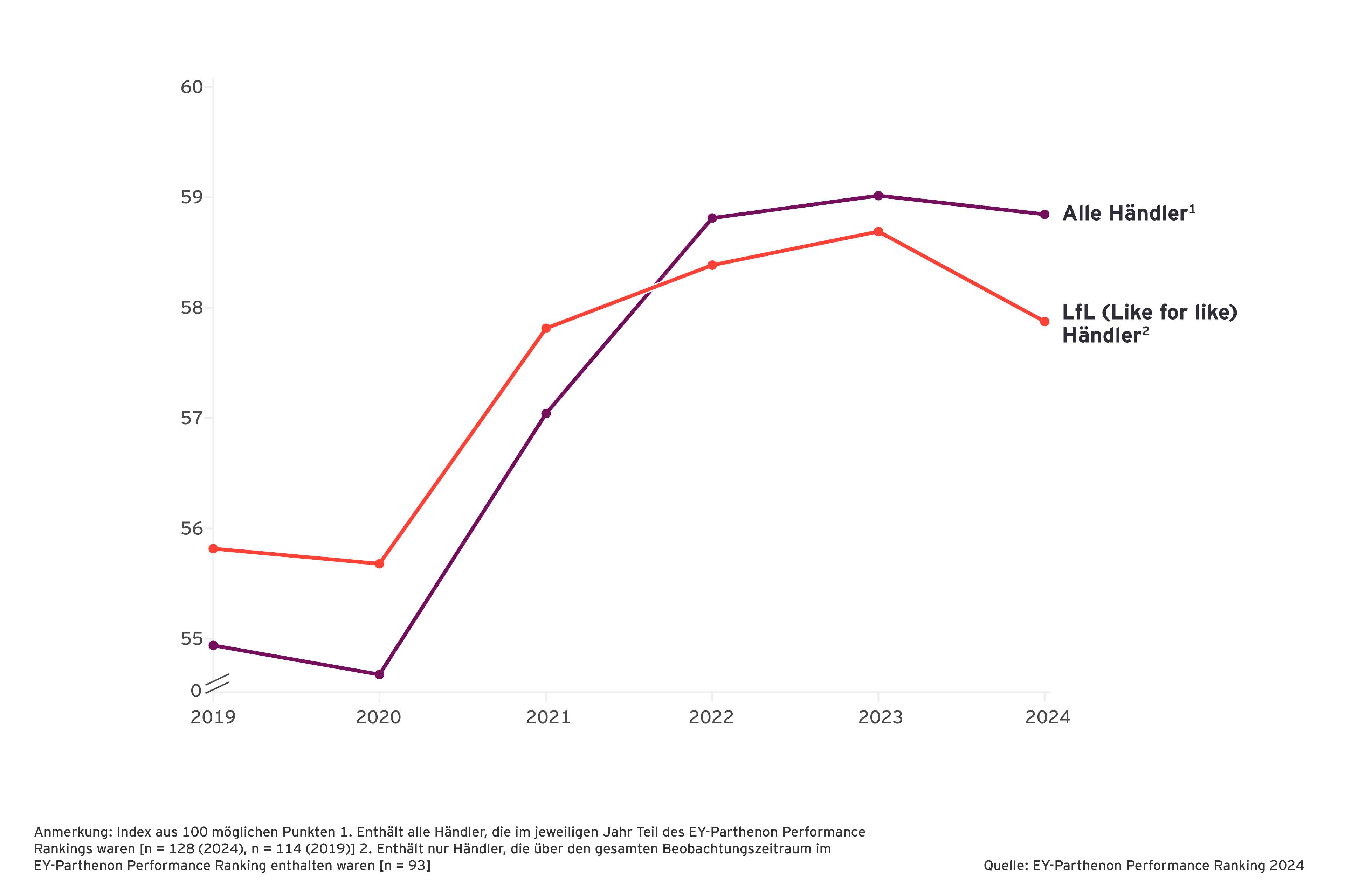 In Zeiten der hohen Inflation und Konjunkturschwäche kaufen Kunden weiterhin Dinge des alltäglichen Bedarfs. Dies spielt z. B. Lebensmitteleinzelhändlern in die Karten, deren Bewertungen im Jahr 2024 deutlich gestiegen sind.