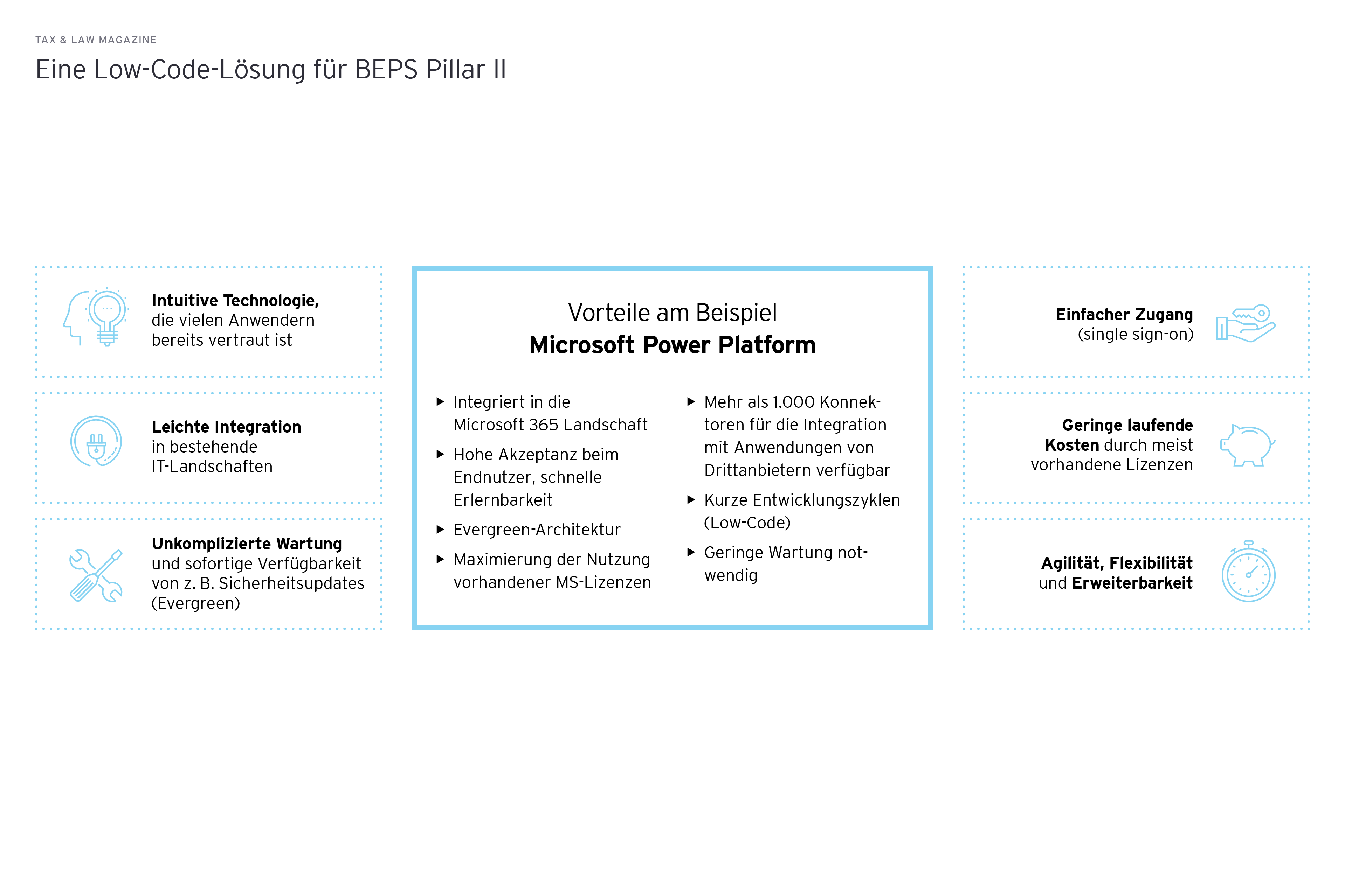 Mit der Power Platform von Microsoft und der Expertise von EY gibt es für Unternehmen bei Pillar II eine Low-Code-Option. Ein Instrument für alle, die ein großes technisches Investment scheuen.