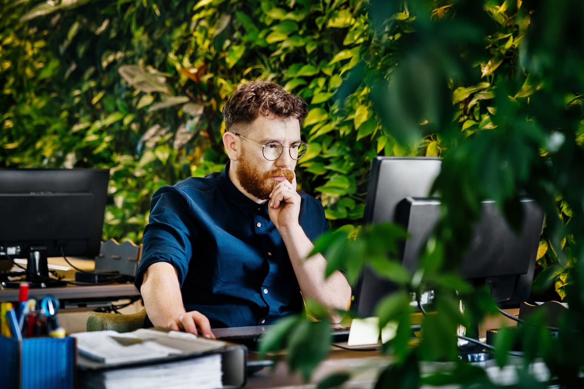 Ein Mann, der konzentriert sitzt und an seinem Computertisch in einem modernen, grünen und grünen Büro arbeitet.