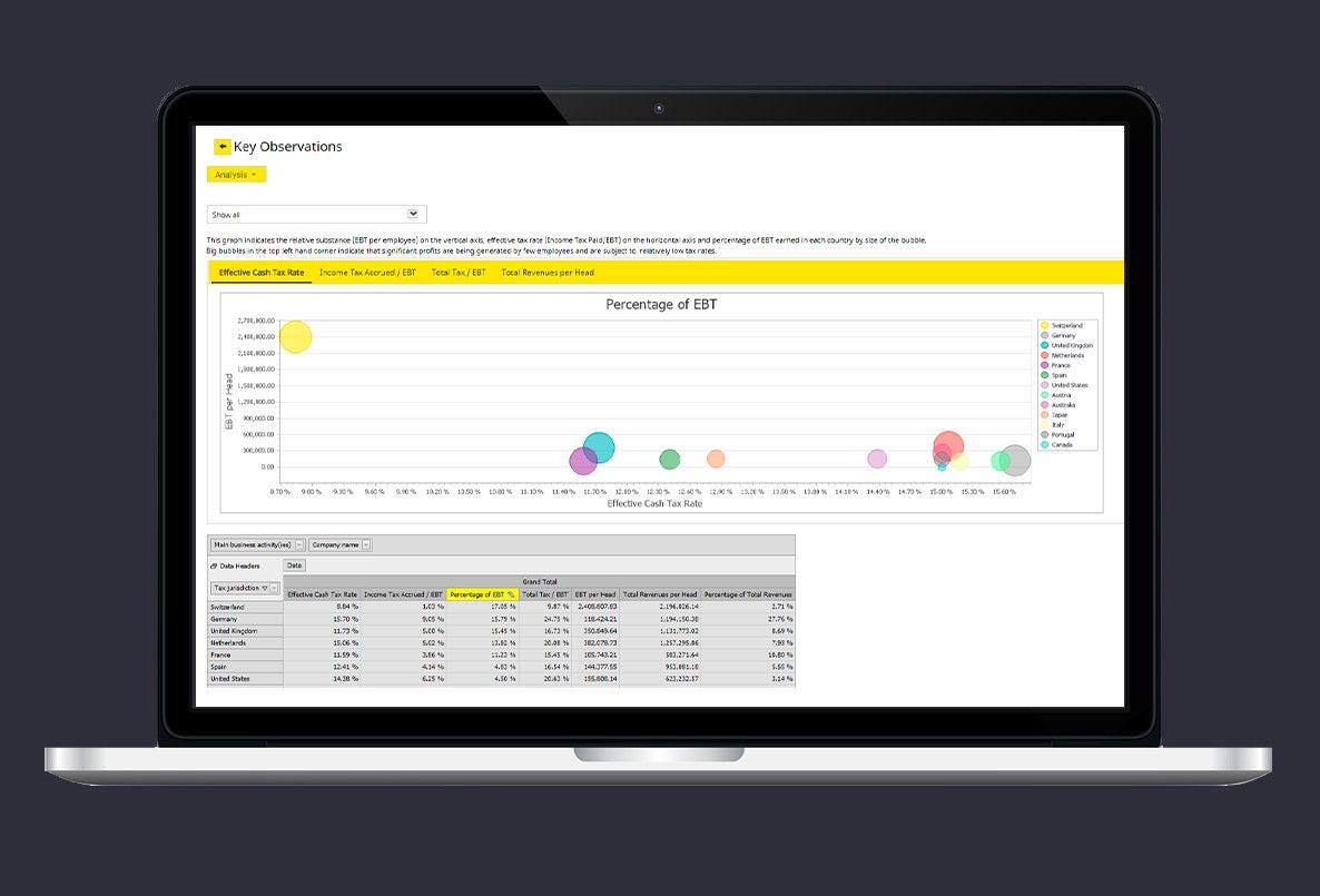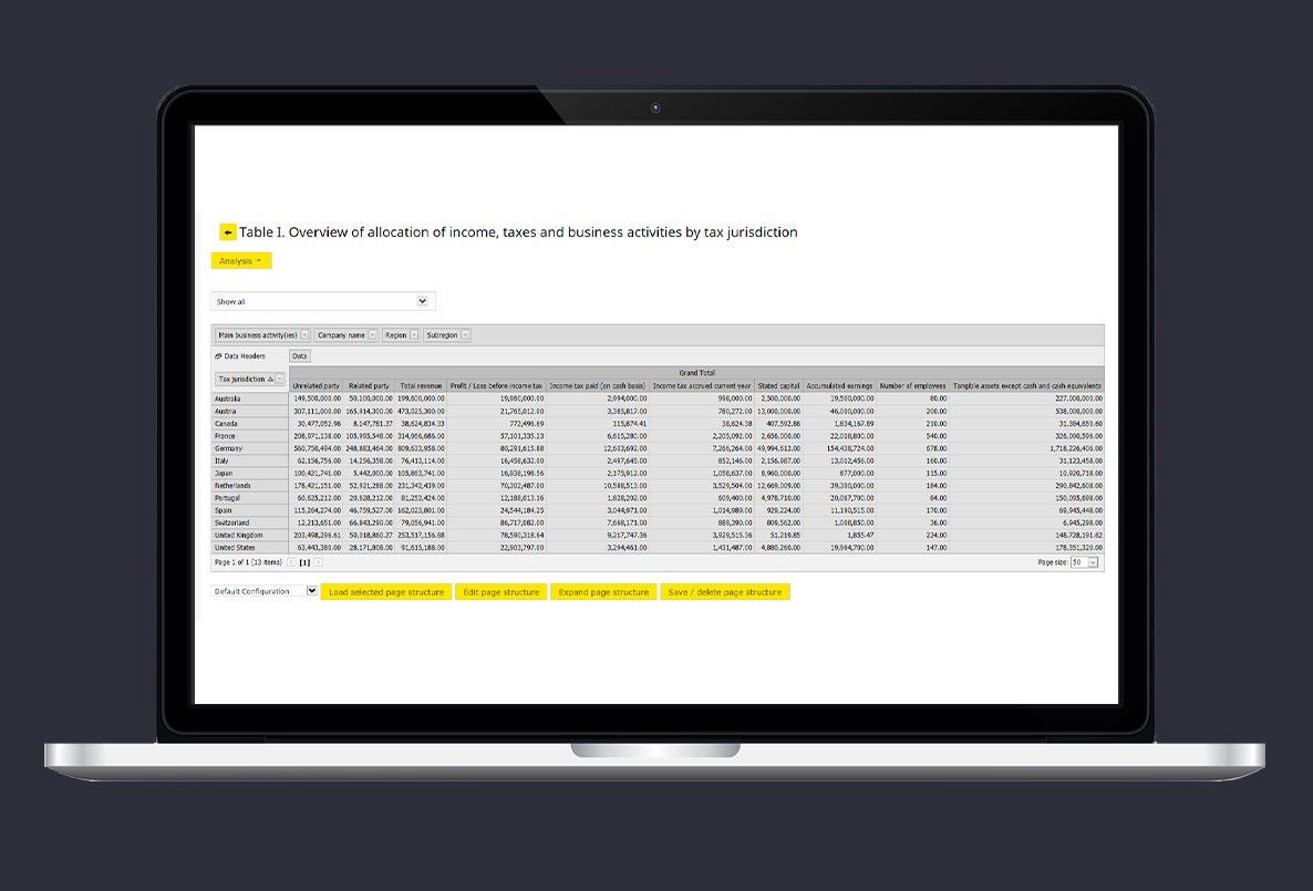 Die Finanzdaten können Sie in CbCR Web mithilfe des integrierten Dashboards analysieren. Auswertungen mit Grafikelementen und verschiedenen KPI's machen Sie auf ungewöhnliche Trends oder mögliche Risikobereiche aufmerksam.