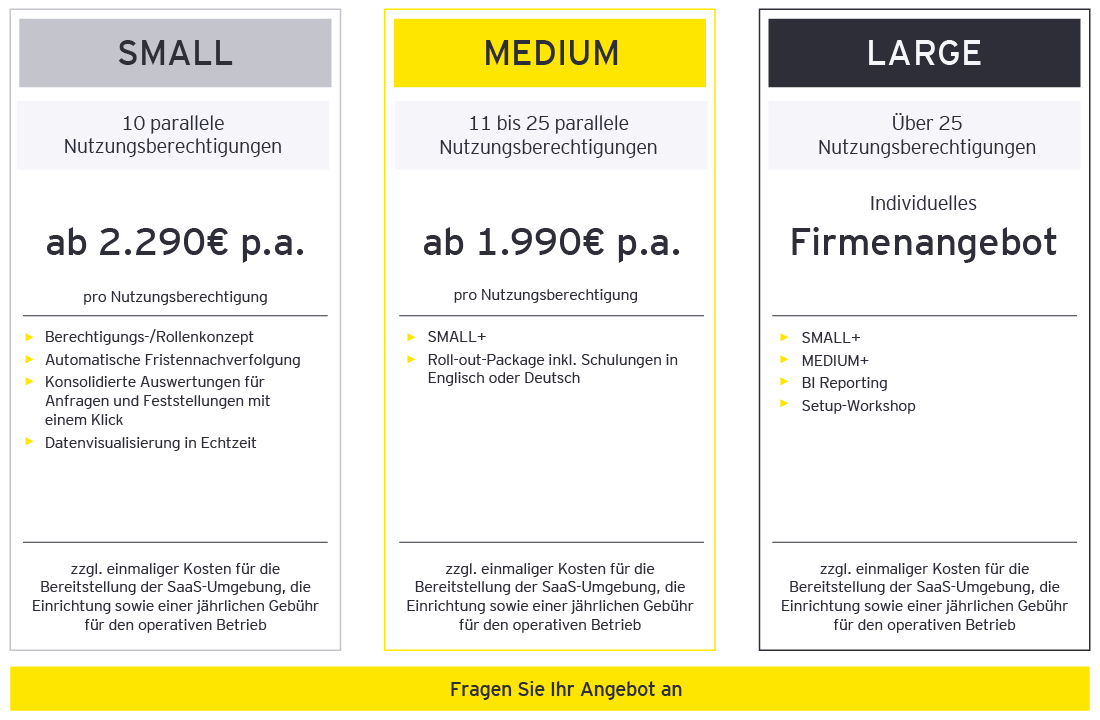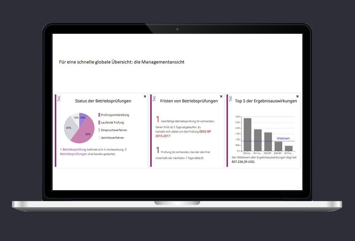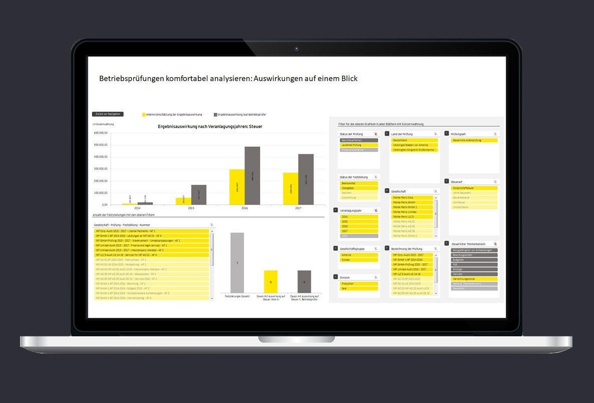 EY Tax Audit Center unterstützt Steuerabteilungen dabei, die steigenden regulatorischen Anforderungen der Behörden an die Betriebsprüfung zu erfüllen. Standardisierte Workflows der Kollaborationsplattform ermöglichen eine effektive Kommunikation und Zusammenarbeit von Betriebsprüfern, Mitarbeitern und Steuerberatern. Dashboards und intelligente Berichte bieten umfassende operative und strategische Auswertungen und Analysen. Betriebsprüfer haben dabei ausschließlich Zugriff auf die für ihre Prüfung relevanten Daten.
