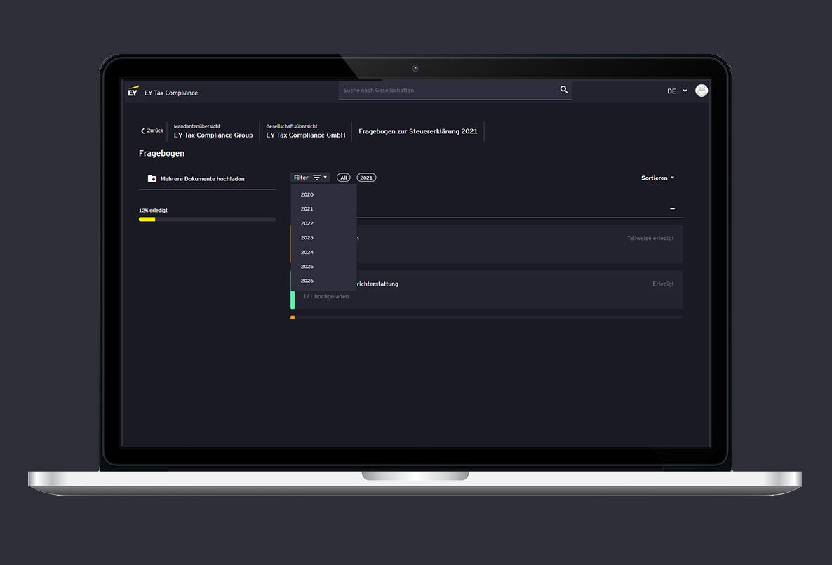 Wie sieht die Zukunft der Steuerdeklaration aus? Die Steuervorschriften werden komplizierter und die Anforderungen der Finanzverwaltung steigen. Umso wichtiger wird eine effiziente Schnittstelle zwischen Unternehmen und Steuerberater:innen. Mit der Plattform „EY Tax Compliance“ haben wir einen innovativen E-Service entwickelt, um gezielt den digitalen Steuererklärungsprozess zu vereinfachen.