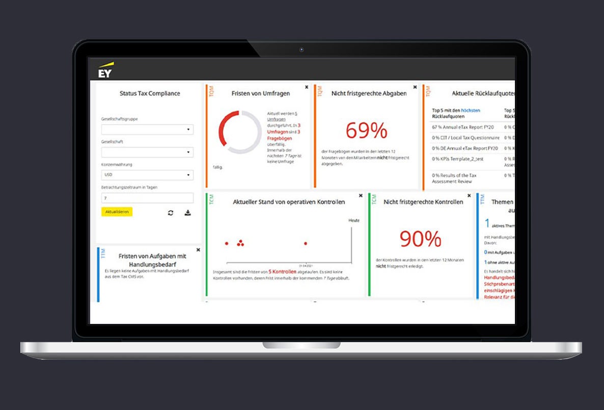 Die Nutzung des EY Tax Questionnaire Managements (TQM Web) erleichtert Ihnen das Einholen großer Mengen benötigter Informationen oder Aussagen. Gleich, ob es sich um Compliance-Bestätigungen der lokalen Geschäftsführung, die Abfrage des Steuererklärungsstatus oder den Stand der Betriebsprüfungen handelt – diese Umfragen können Sie und Ihre Teams in kürzester Zeit erledigen. Die Dashboards sowie einstellbare automatische E-Mail-Erinnerungen helfen dabei, dass Sie innerhalb des geplanten Zeitrahmens bleiben. So stellen Sie sicher, dass Sie immer über Echtzeit-Informationen zum Bearbeitungsstand verfügen.