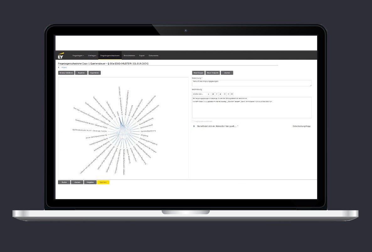 Mit der Kollaborationsplattform EY Tax Questionnaire Management (TQM Web) können Sie Umfragen aller Art selbst und flexibel gestalten, Antworttypen, wie zum Beispiel Text, Währung, Tabelle etc., vorgeben und Fragen miteinader verknüpfen. So reduzieren Sie selbst komplexe Fragebögen auf das relevante und wesentliche Maß. Nutzen Sie intelligente Fragebögen als Maßnahme oder Kontrolle in Ihren Tax CMS-Projekten.