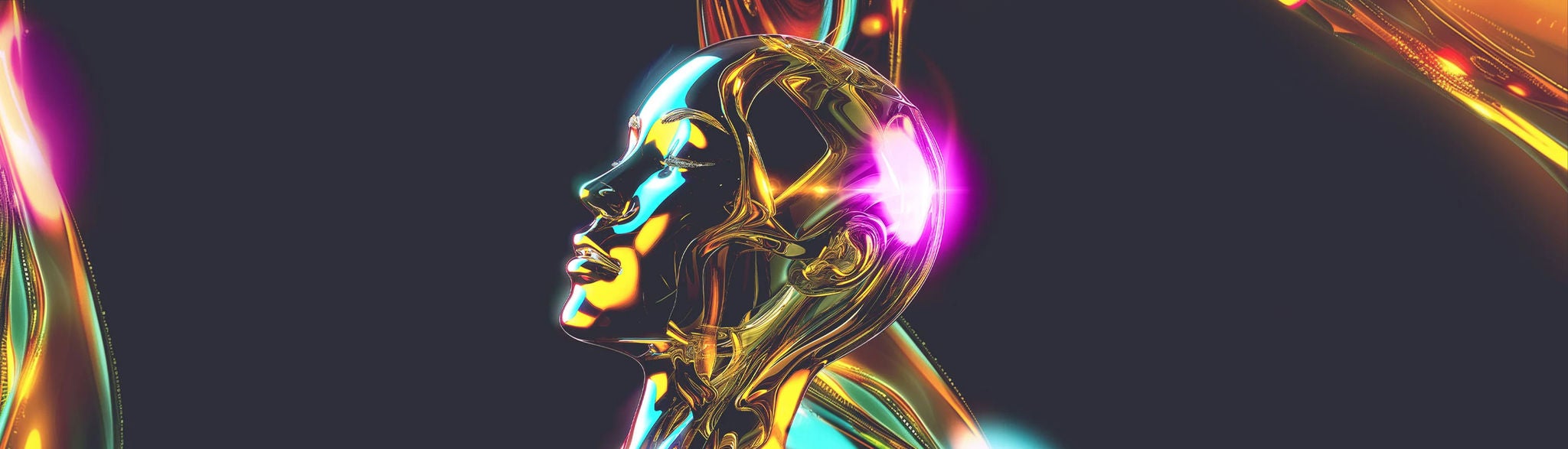 Futuristisches Kunstwerk eines goldmetallischen, stilisierten menschlichen Kopfes mit farbenfrohen abstrakten Formen
