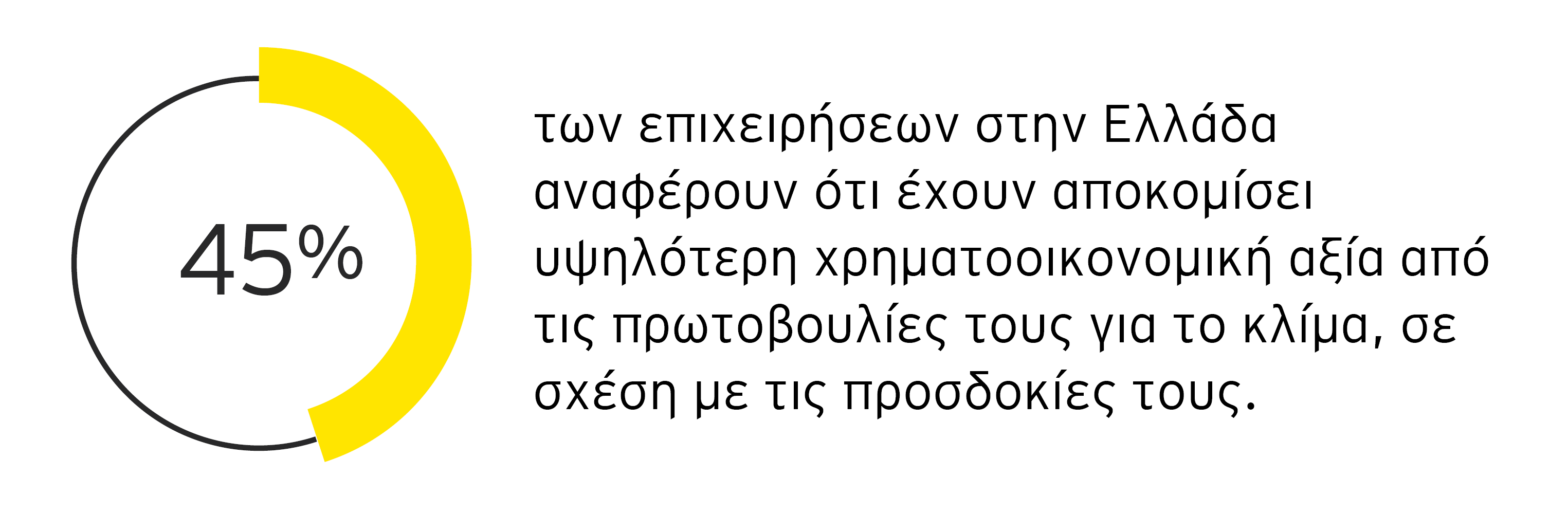 Οι στόχοι της προστασίας του πλανήτη από την κλιματική αλλαγή είναι συμβατοί με τη δημιουργία χρηματοοικονομικής αξίας. Το 45% των ερωτηθέντων έχουν επιτύχει υψηλότερη από την αναμενόμενη χρηματοοικονομική αξία, ως αποτέλεσμα των δράσεών τους για την κλιματική αλλαγή. Μια ολιστική προσέγγιση της βιώσιμης ανάπτυξης που συνυπολογίζει τα χρηματοοικονομικά οφέλη, καθώς και τα οφέλη για τους εργαζόμενους και τους πελάτες, τείνει να προσθέτει περισσότερη αξία για τον πλανήτη.