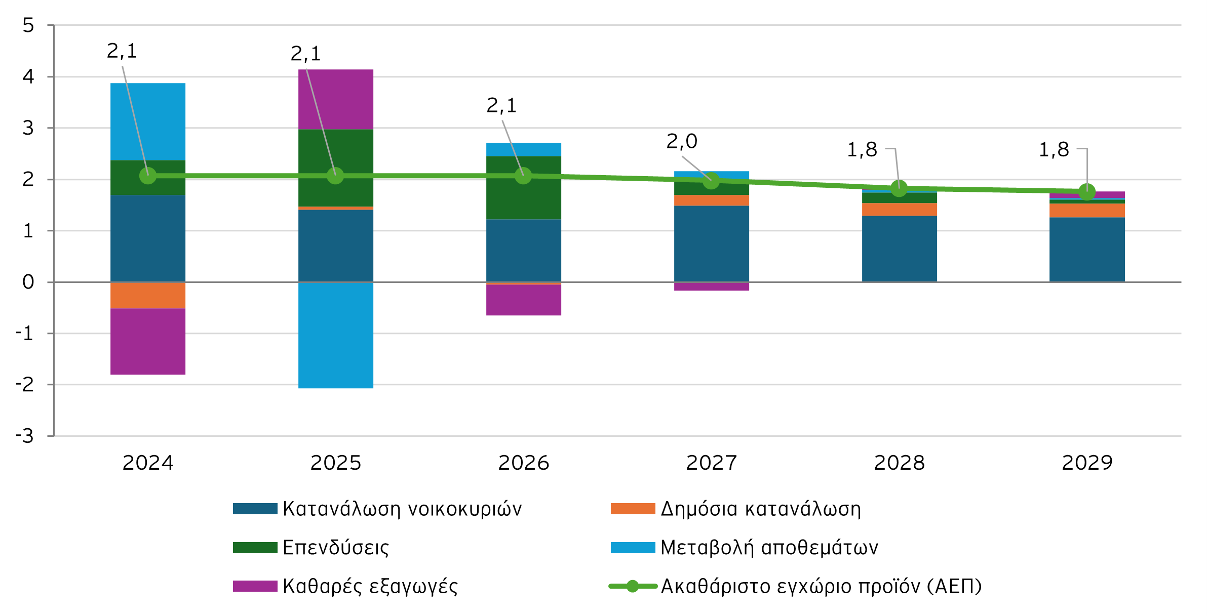 Ο δομικός πληθωρισμός στη ζώνη του ευρώ έχει σταθεροποιηθεί κοντά στο 2%, αν και τα αποτελέσματα του διαφέρουν από χώρα σε χώρα, αντανακλώντας διαφορές στις αυξήσεις μισθών, στις ρυθμιζόμενες τιμές και στους ειδικούς φόρους κατανάλωσης. Εξαιτίας των υψηλότερων τιμών ενέργειας, ο πληθωρισμός αναμένεται να αυξηθεί ελαφρώς το 2026, με μέσο όρο στο 2,4%, ενώ ο δομικός πληθωρισμός παραμένει κοντά στον στόχο. Με τις τιμές των πρώτων υλών να υποχωρούν, ο πληθωρισμός αναμένεται να επιβραδυνθεί το 2027. Ο ρυθμός αύξησης των τιμών θα μπορούσε να παρουσιάσει ξανά άνοδο το 2028, εάν επεκταθεί η εφαρμογή του συστήματος εμπορίας εκπομπών (ETS).