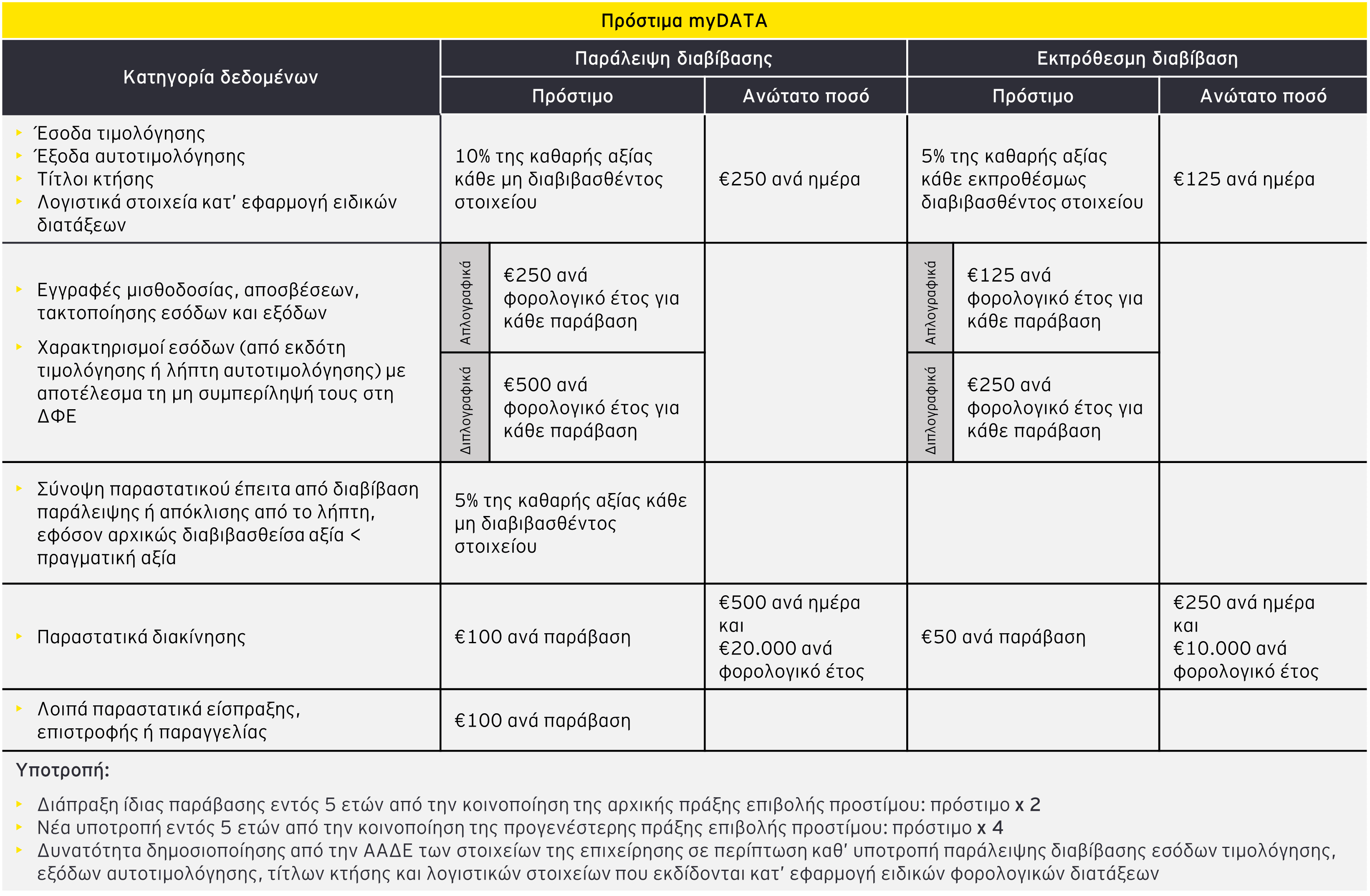 - Πρόστιμα σχετικά με την παράλειψη και την εκπρόθεσμη διαβίβαση δεδομένων στην ψηφιακή πλατφόρμα myDATA.