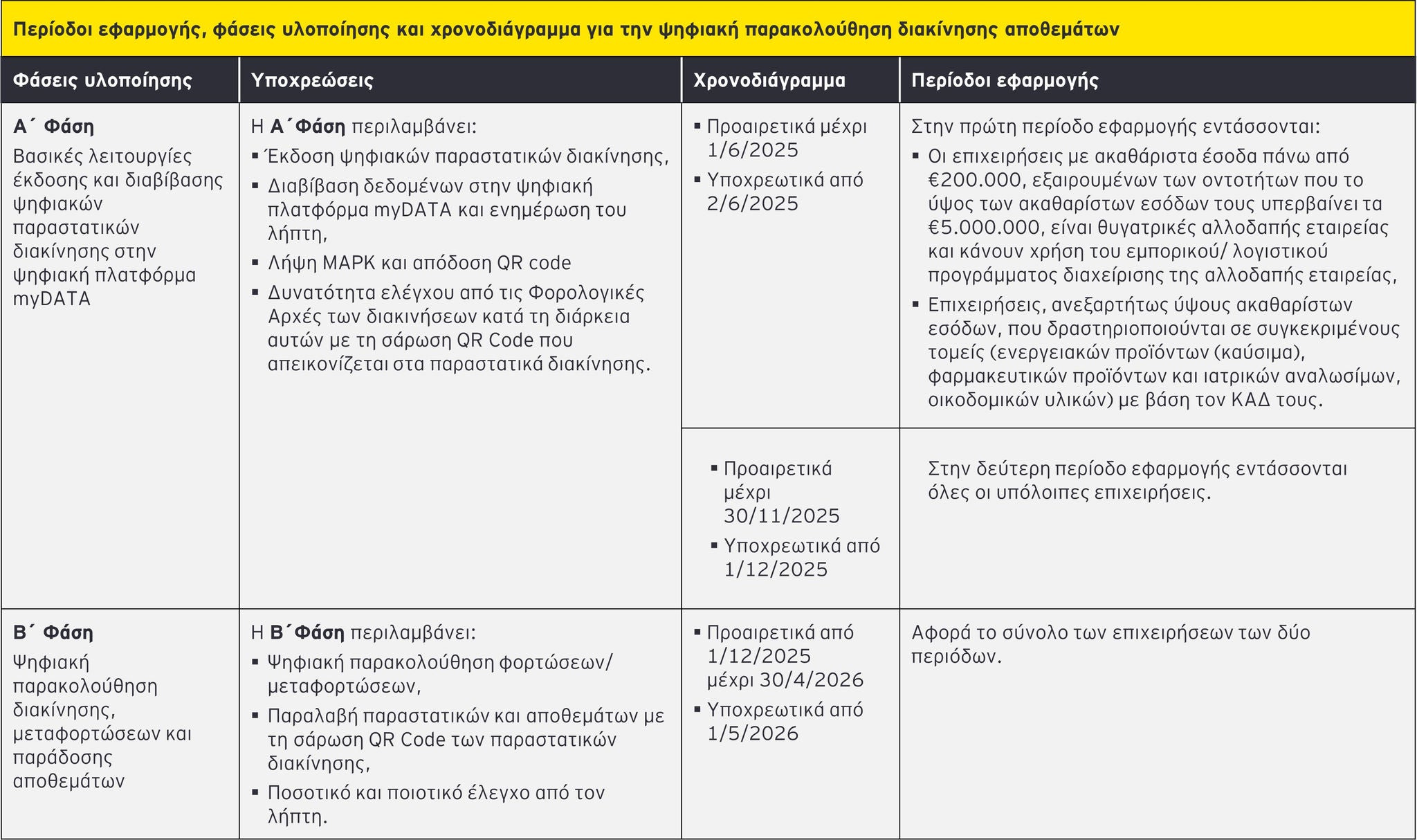 Μετατίθενται οι προθεσμίες έναρξης της δεύτερης φάσης εφαρμογής της ψηφιακής παρακολούθησης διακίνησης αποθεμάτων για το σύνολο των επιχειρήσεων, η οποία θα είναι υποχρεωτική από την 1η Μαΐου 2026 και εφεξής.