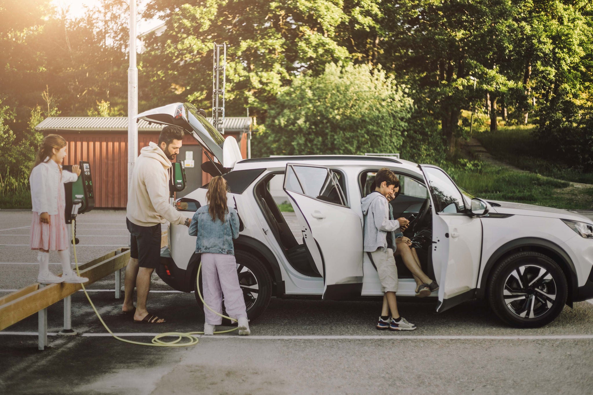 Family charging electric car at station