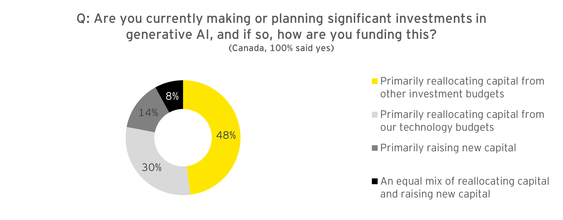 All Canadian respondents indicated that they are making, or have made, significant investments in generative AI, compared to 99% of global CEOs. Nearly half of Canadian leaders are also sourcing funds primarily by reallocating capital from other investment budgets, highlighting AI as a strategic imperative for Canadian businesses. Comparatively, nearly 40% of global CEOs are reallocating budget from other investments to support AI investments.