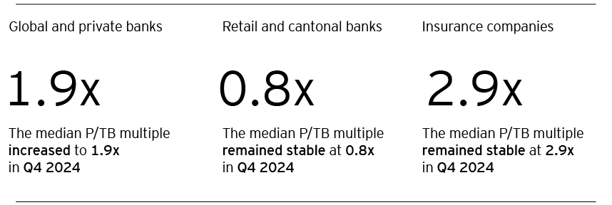 • Concurrently, the Price-to-Tangible Book (P/TB) ratio exhibited an upward trend for global and private banks, while remaining unchanged for retail and cantonal banks as well as for insurance companies, when compared to the preceding quarter.