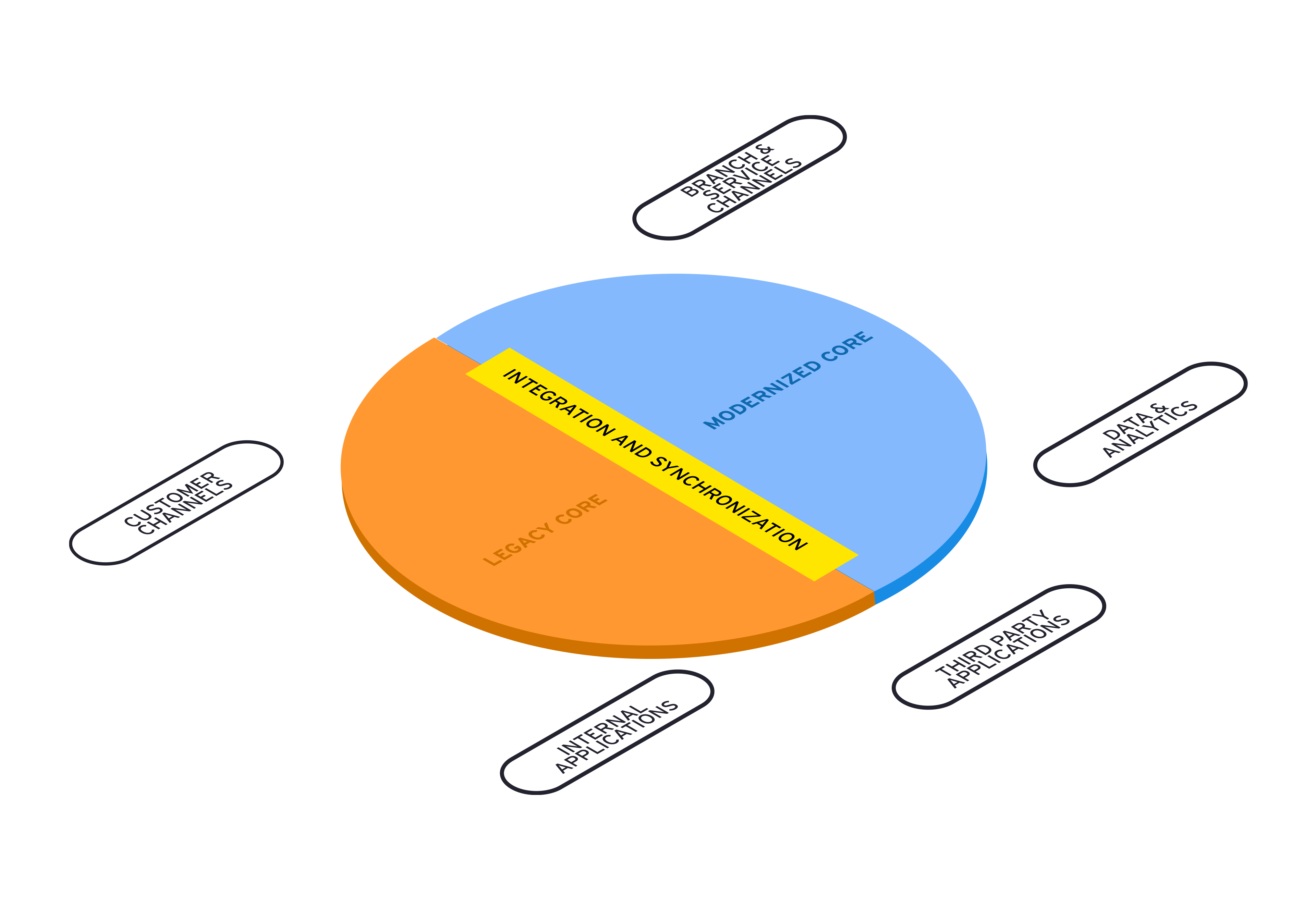 A circular graphic divided in half depicts how the product can support integration and synchronization of both a new, modernized core, alongside existing legacy systems, including: customer channels, internal applications, third-party application, data and analytics and branch and service channels.