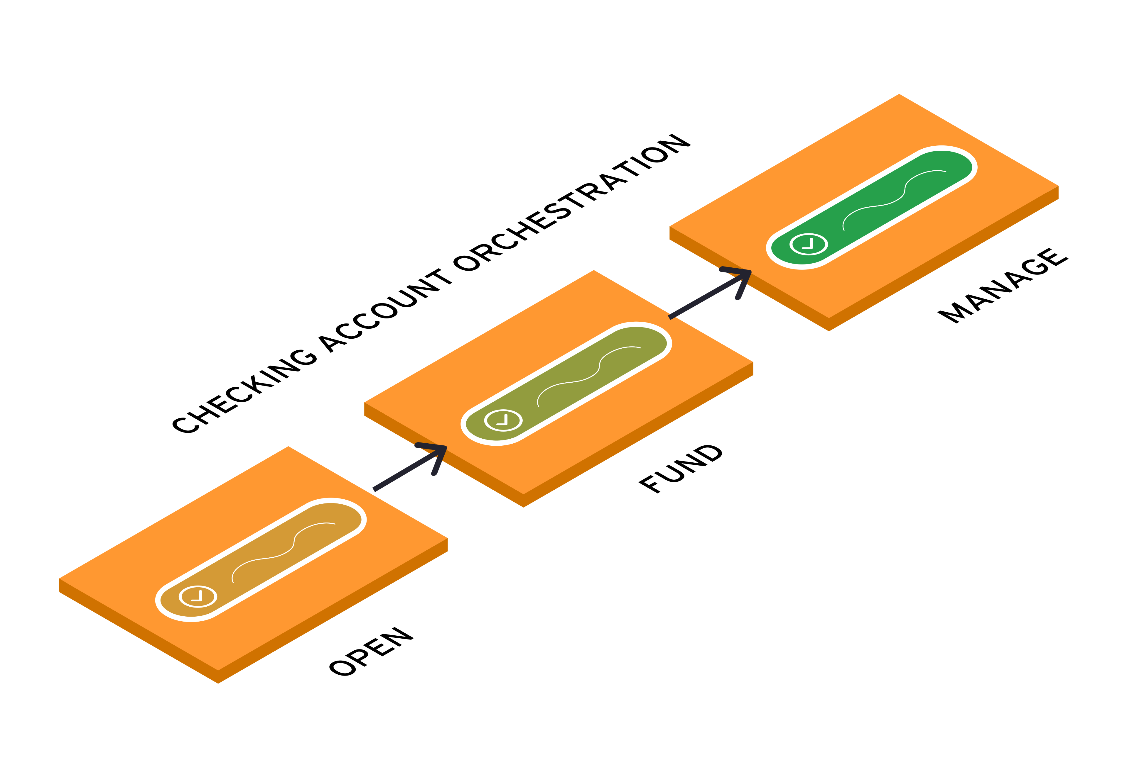 The image illustrates the seamless journey of checking account orchestration, depicting a streamlined process that begins with the account opening phase, transitions into the funding stage, and culminates in the ongoing management of the account.