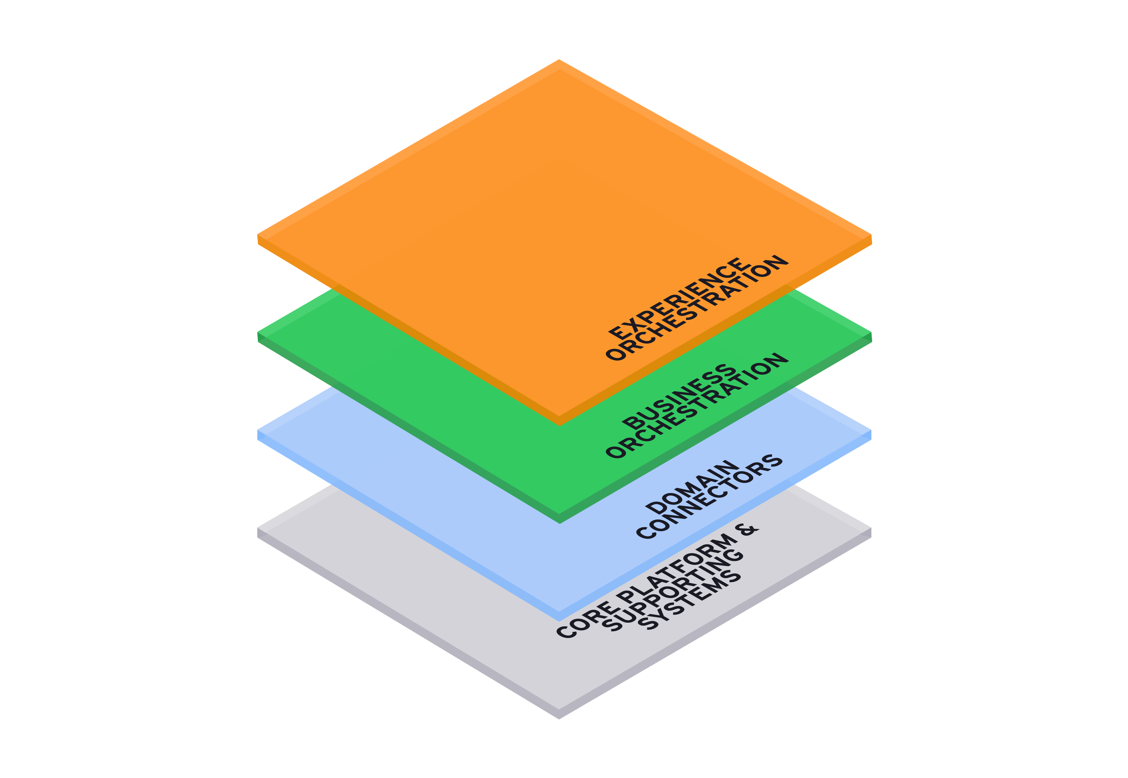 The image depicts a vertical stack of layers representing flexible configuration across three primary components: experience orchestration, business orchestration and domain connectors over the top of the core platform and supporting systems.