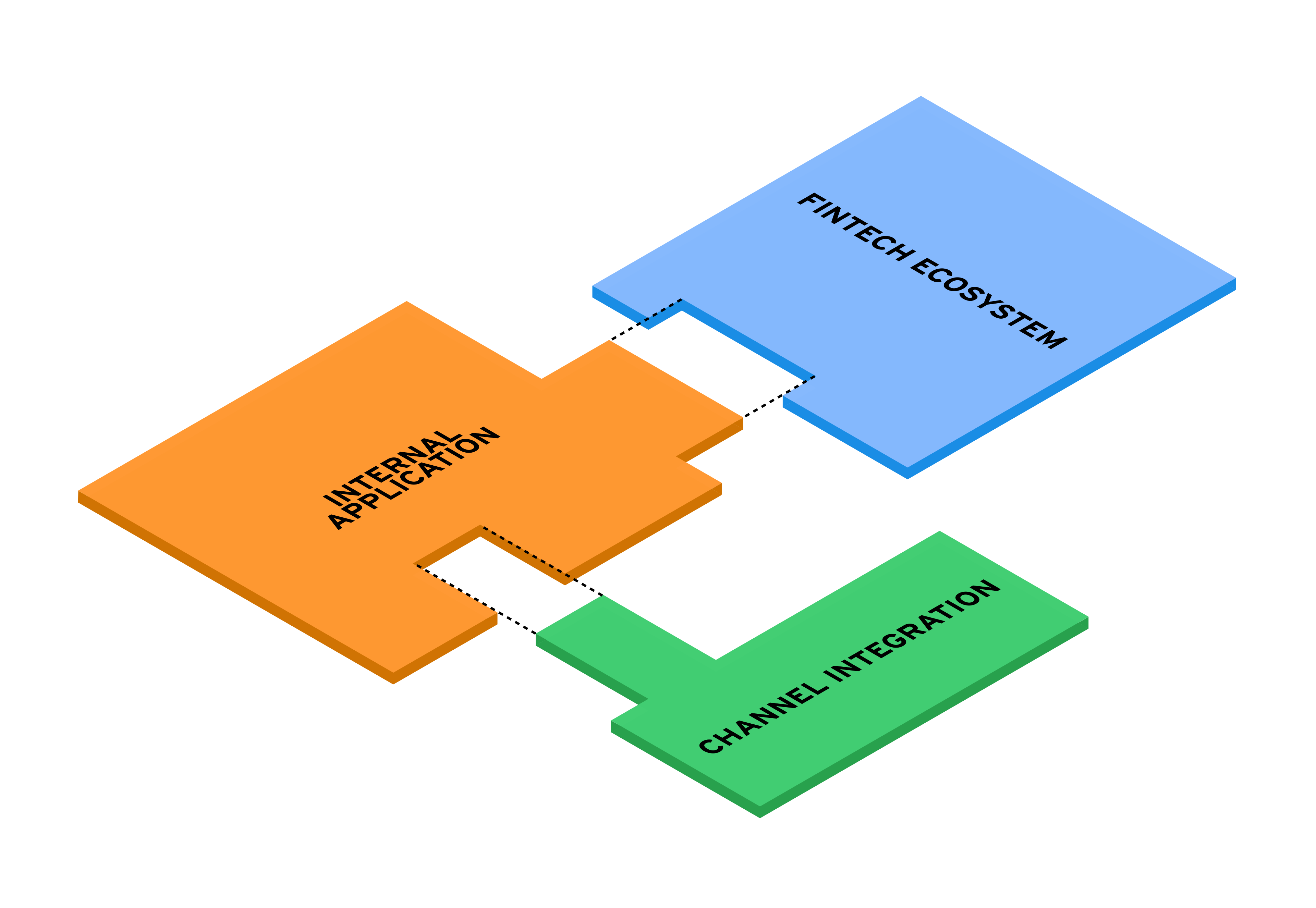 The image features three interlocking puzzle pieces, each symbolizing a crucial component of a modern banking infrastructure that works in harmony to create a cohesive financial service experience. A central internal application empowers the bank to synchronize with a FinTech ecosystem ensuring integrated channels for an exceptional customer experience.