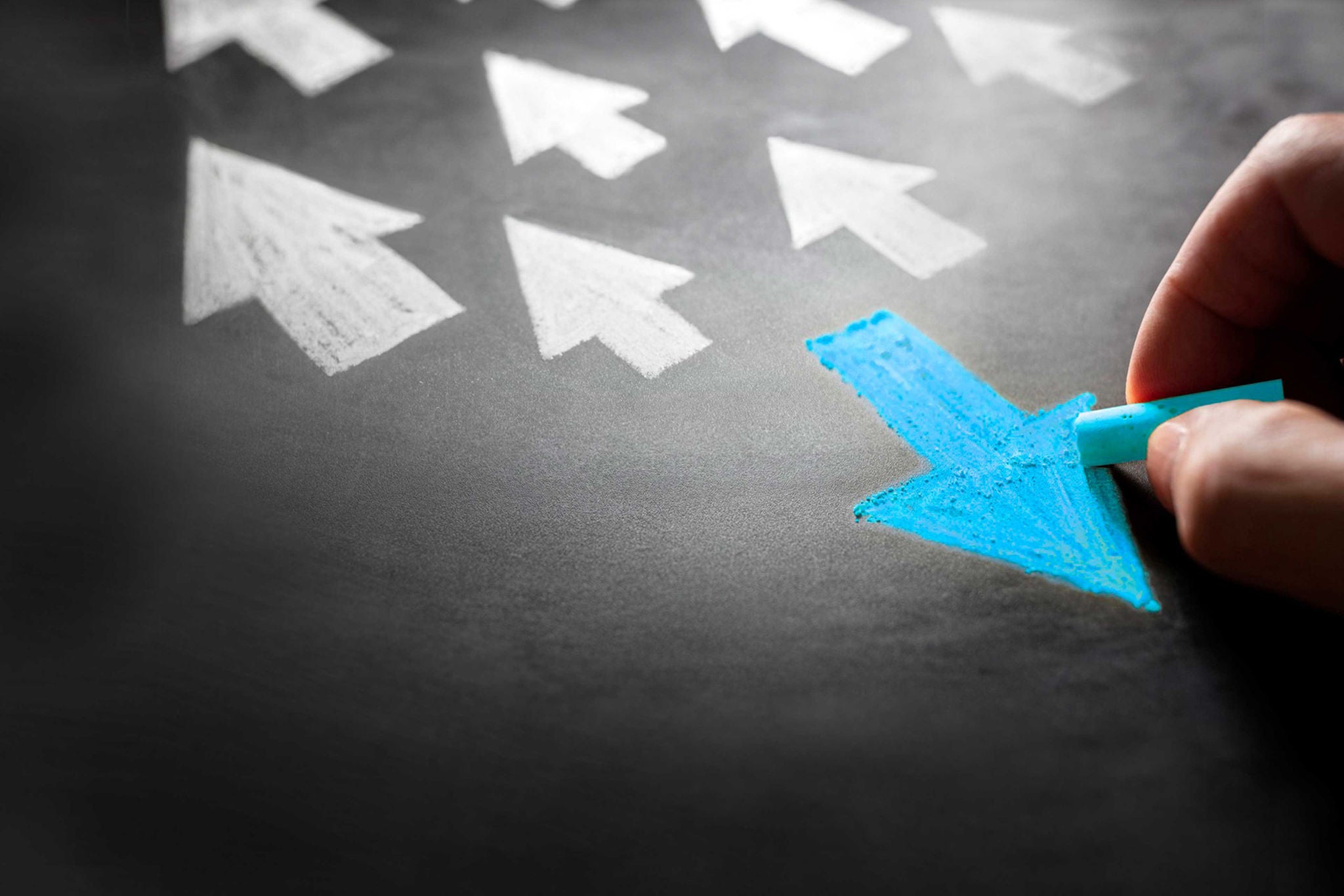 hand drawing a blue arrow on a blackboard