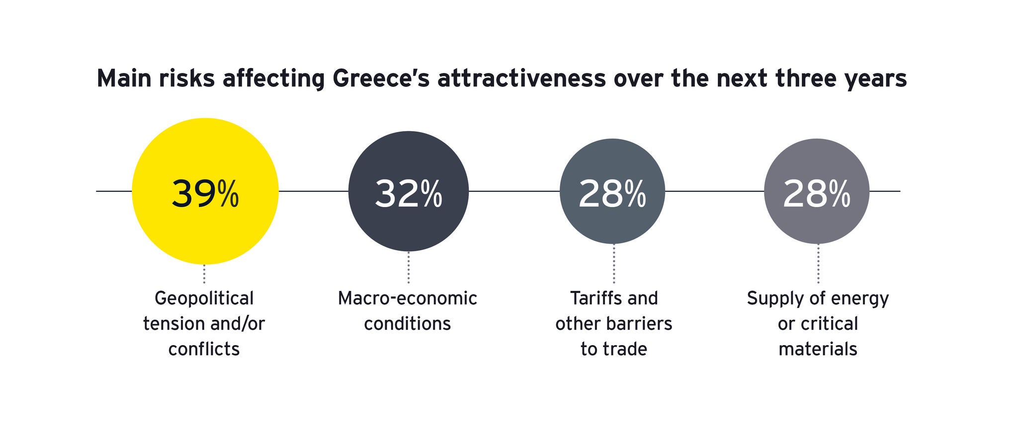 Three out of five participants (60%, compared to 62% last year) stated that over the past year, their perception of Greece has improved as a place where their business might establish or develop its activities. Specifically, among companies that currently do not have an investment presence in the country, the percentage has increased from 39% to 41%. At the same time, 63% (down from 69% last year) believe that the country’s attractiveness will further increase over the next three years. This percentage compares positively to the corresponding figure for the whole of Europe (61%) and other European countries surveyed.