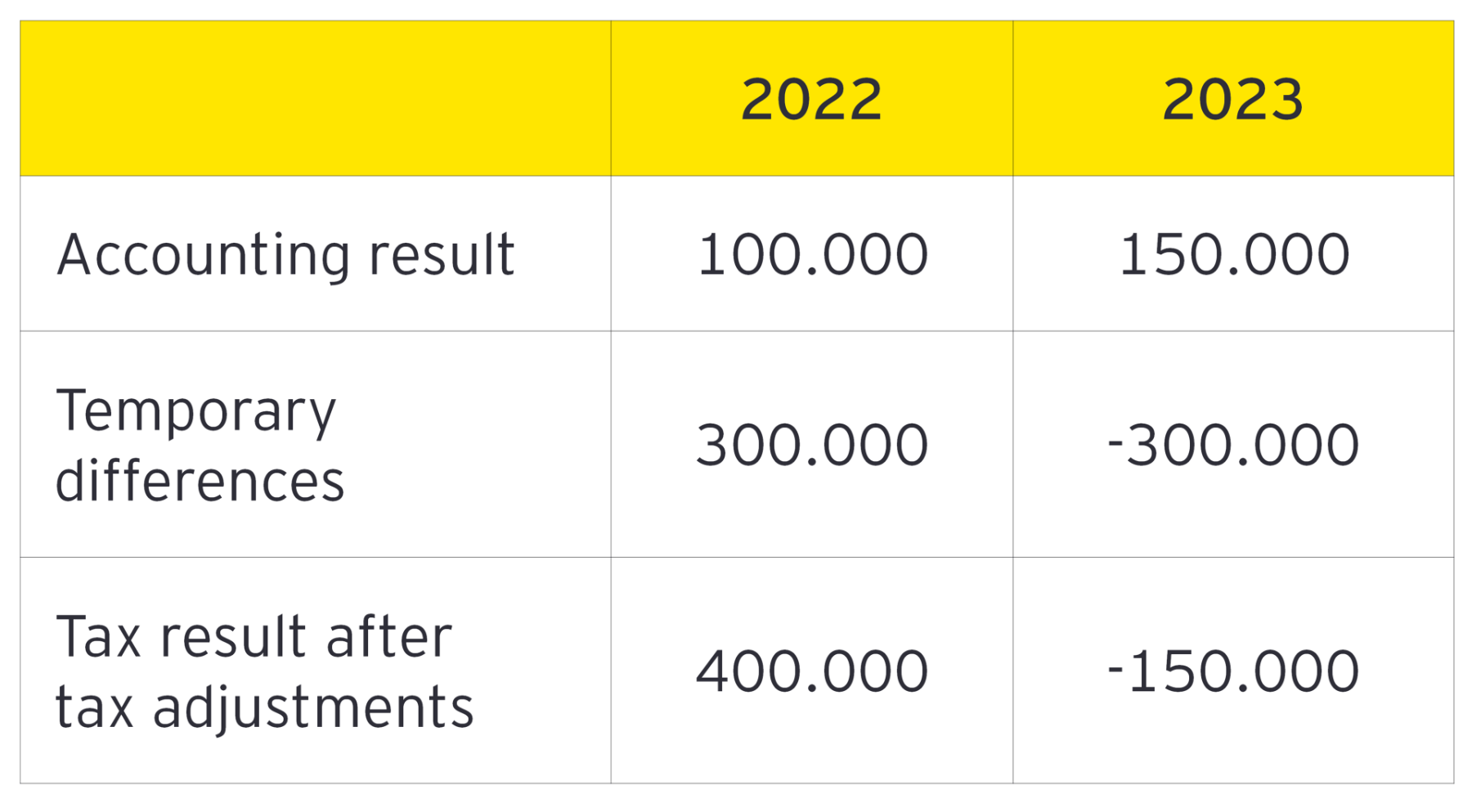 For example, a Société Anonyme, at the end of its first tax year 2022 has accounting profits €100.000 and temporary differences between the accounting and tax base €300.000 (positive). As a result, the tax results of the year after the tax adjustments amount to €400.000 and are subject to income tax.
