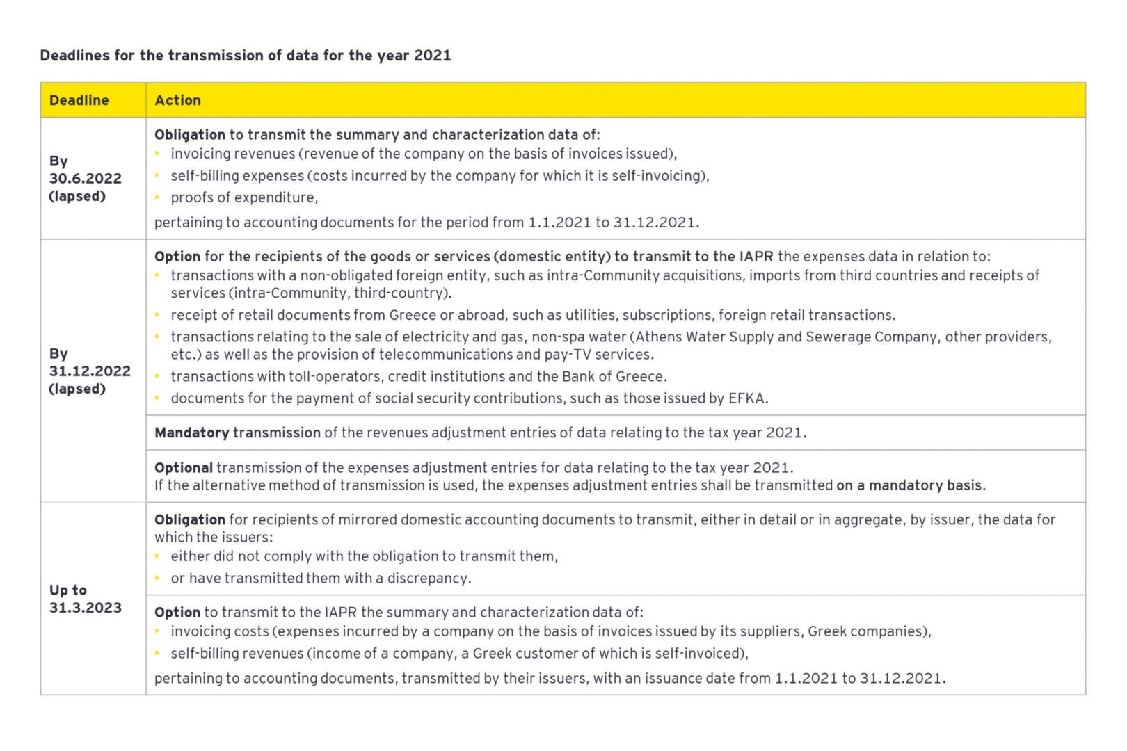 - For 2022 transactions, revenues’ data are transmitted until 28.2.2023, expenses’ data until 31.3.2023, omissions and discrepancies until 30.4.2023 and adjusting entries until the filing of the 2022 income tax return.