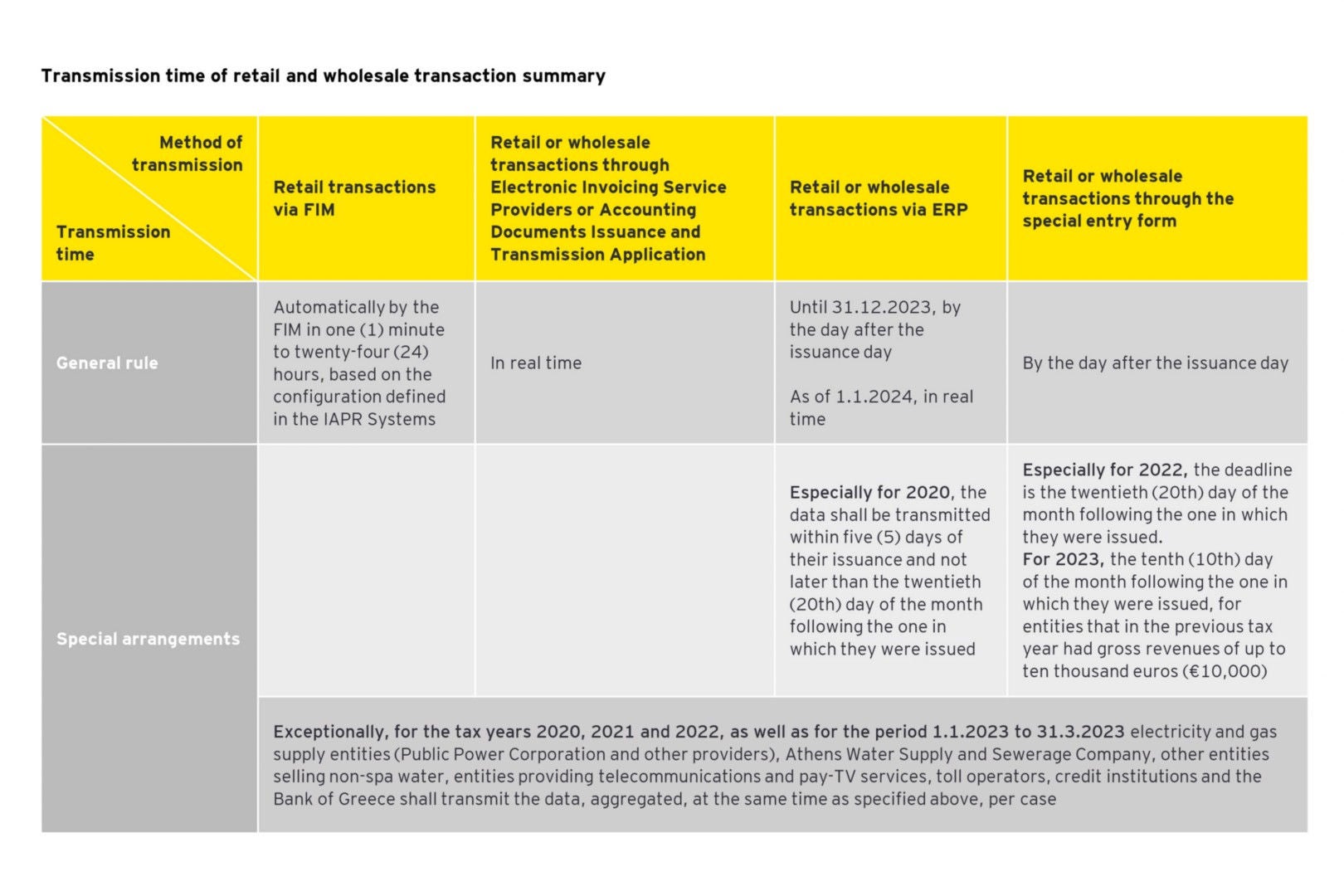 - Furthermore, the transmission deadline for transactions of year 2023 for the entities which had gross revenues of up to ten thousand euros (€10,000) in the previous tax year and transmit the required data through the special entry form, is set on the tenth (10th) day of the following month in which the data were issued.
