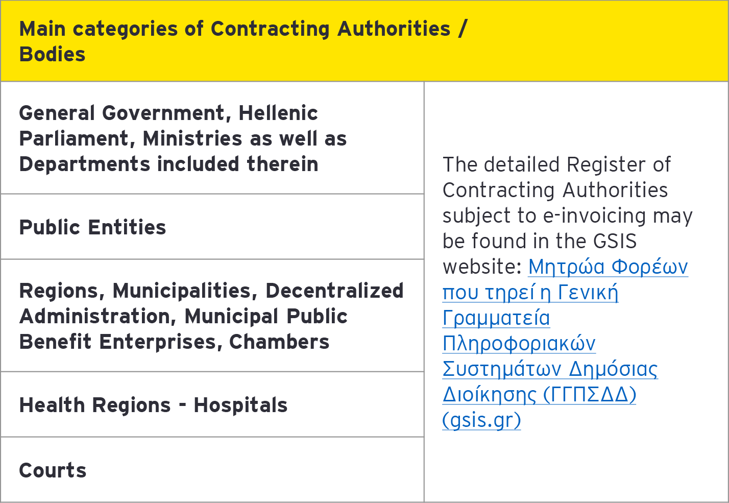 - A gradual integration of economic bodies in the mandatory e-invoicing regime is provided, depending on the counterparty/contracting authority and the legal framework governing the relevant contracts.