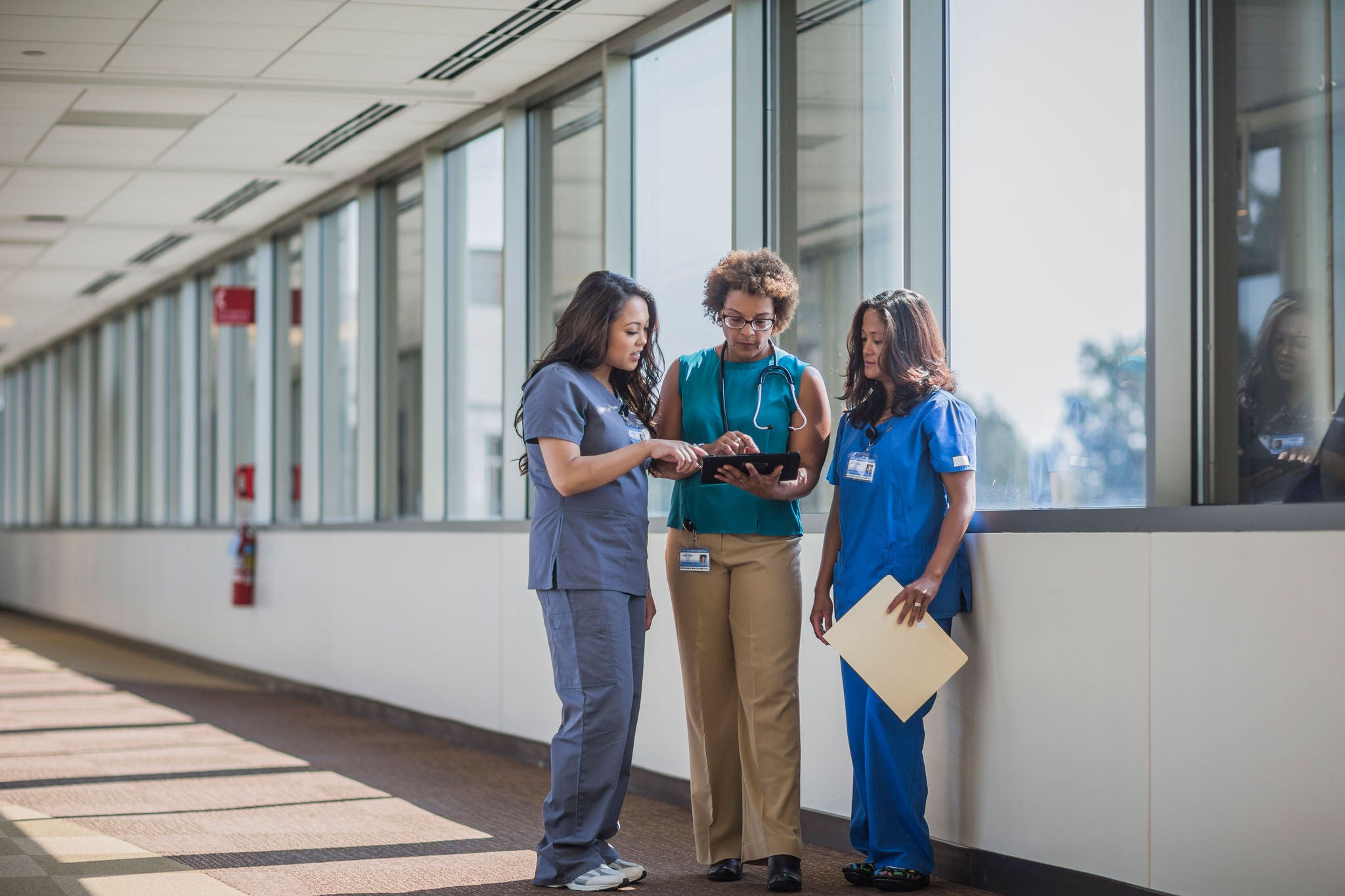 Nurses speak with doctor looking at digital tablet