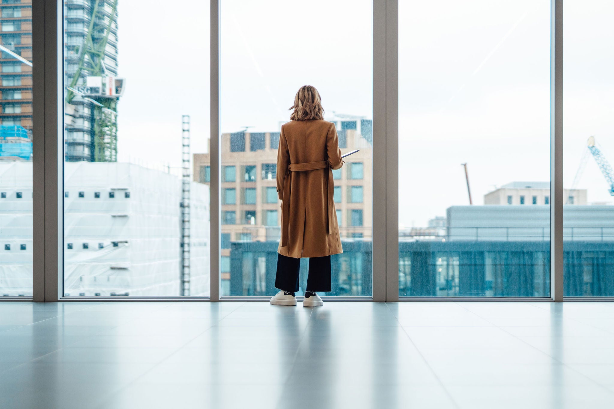 Back view of businesswoman standing and looking through window in conference room.