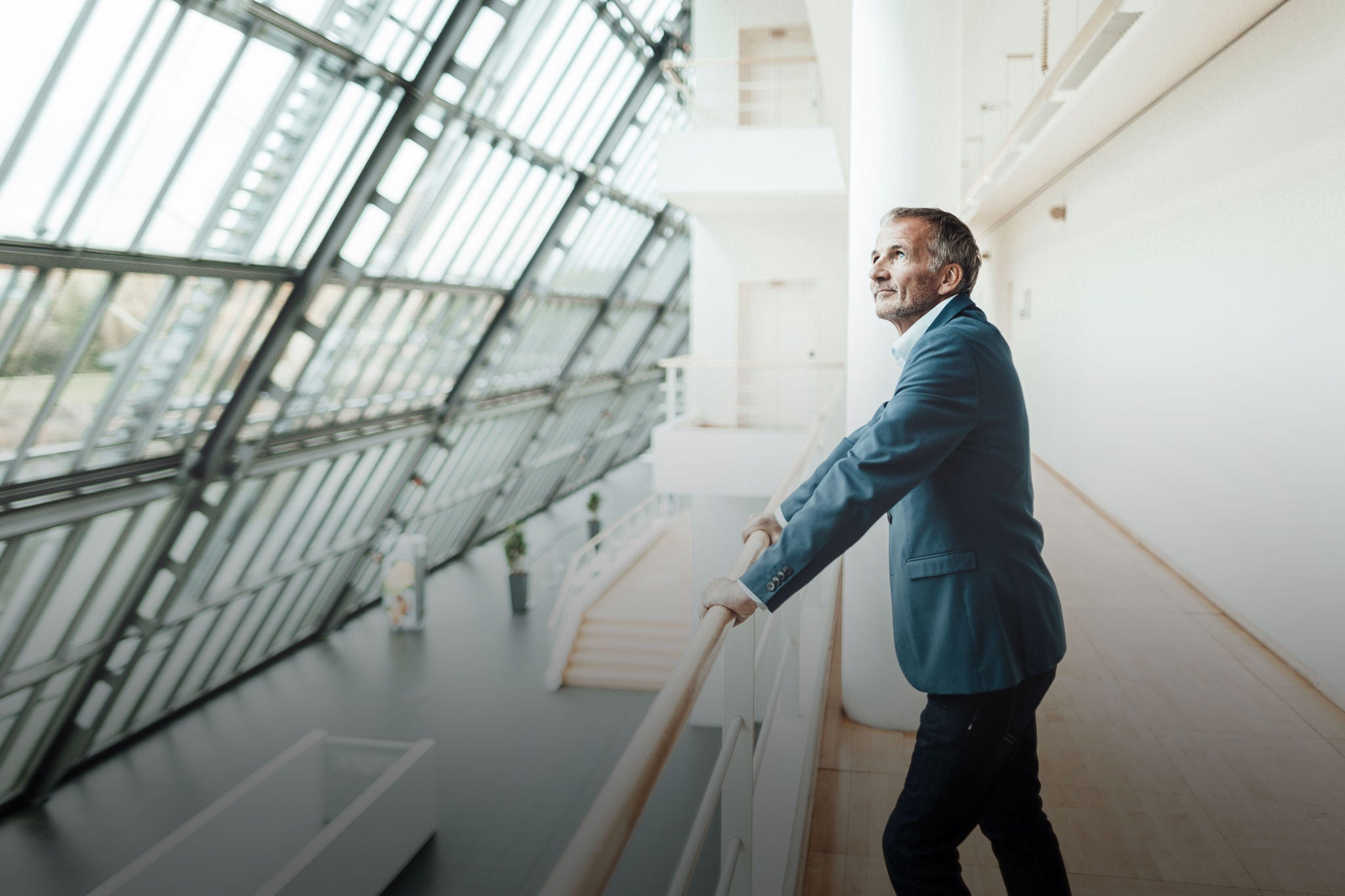 Thoughtful businessman looking away while leaning on railing in office corridor