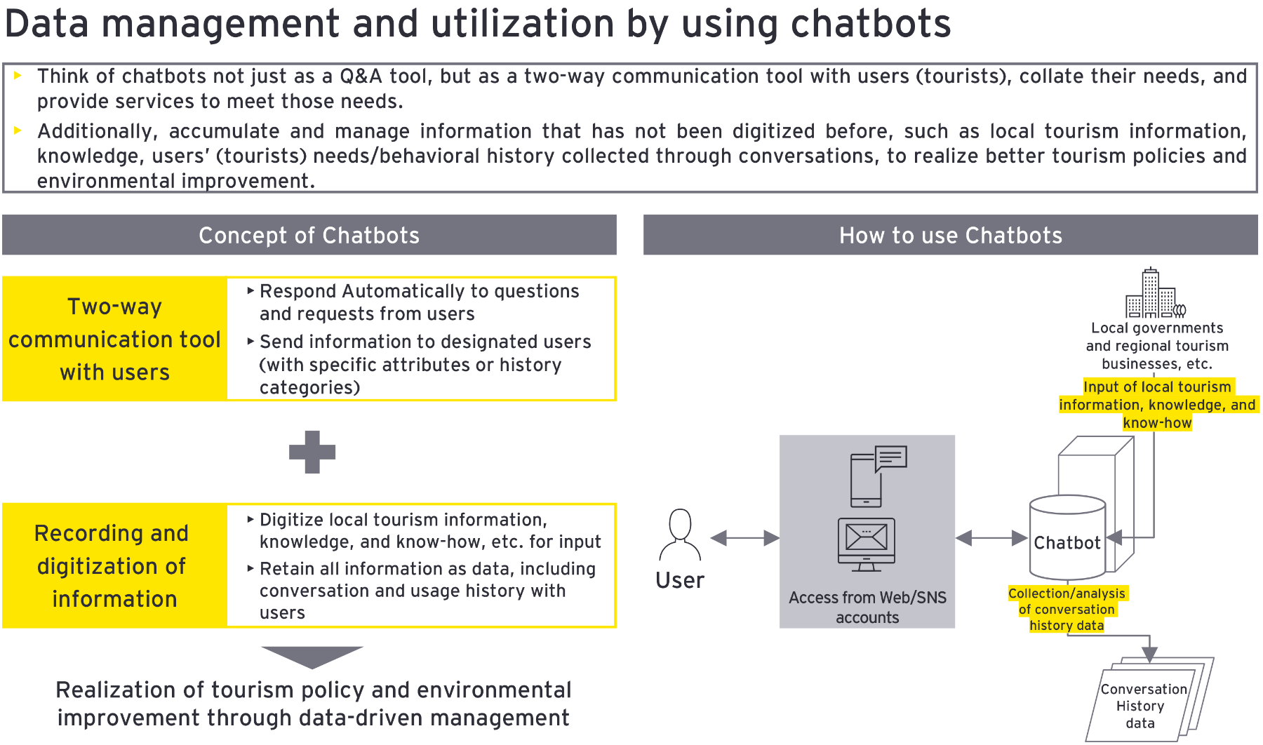 In accordance with our mission to support strategy planning and ecosystem formation for data utilization in businesses, EY builds a framework for collecting and utilizing data to support tourism DX, makes policy recommendations, and engages in efforts related to data-driven businesses and corporate support, with a focus on regional revitalization and tourism.