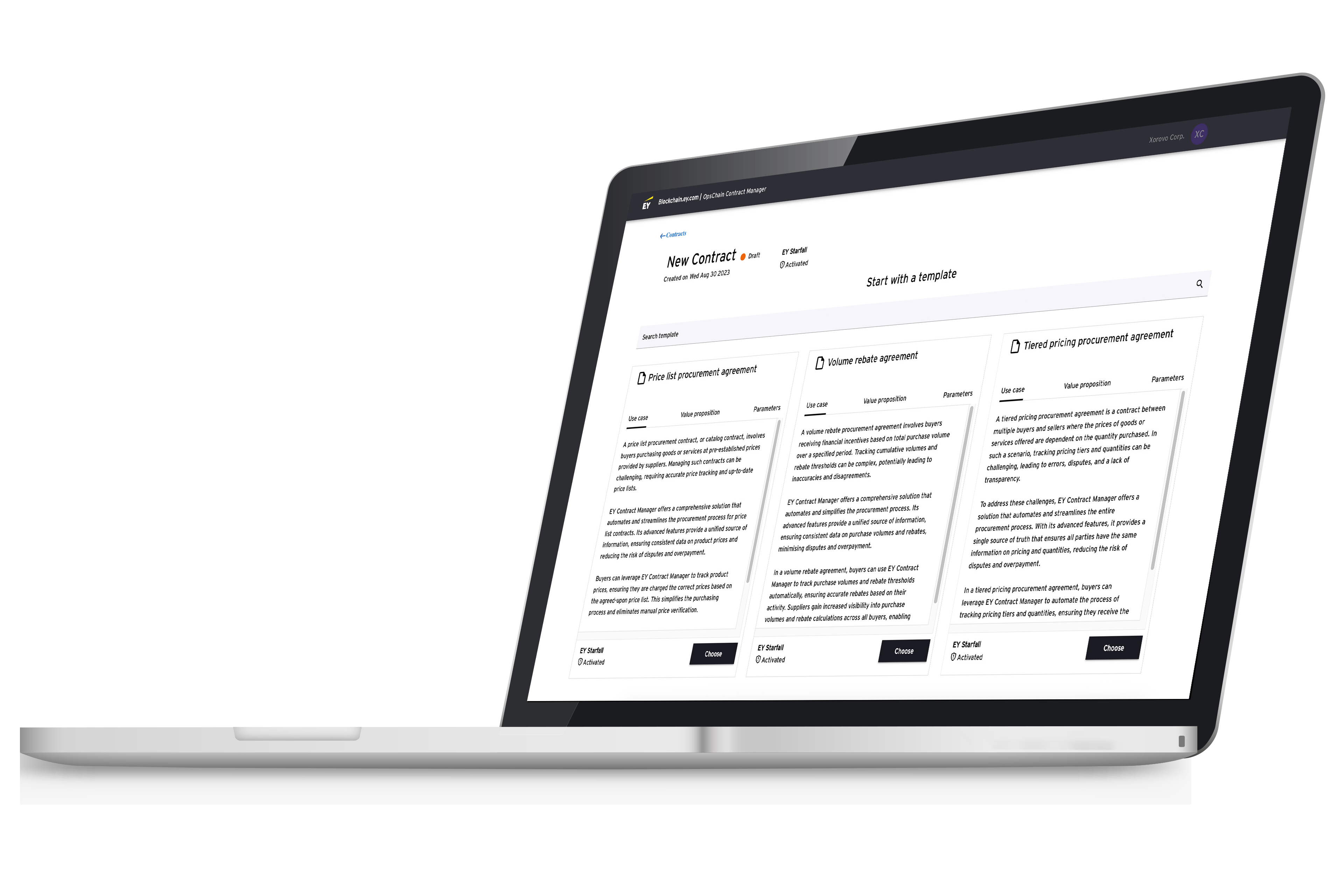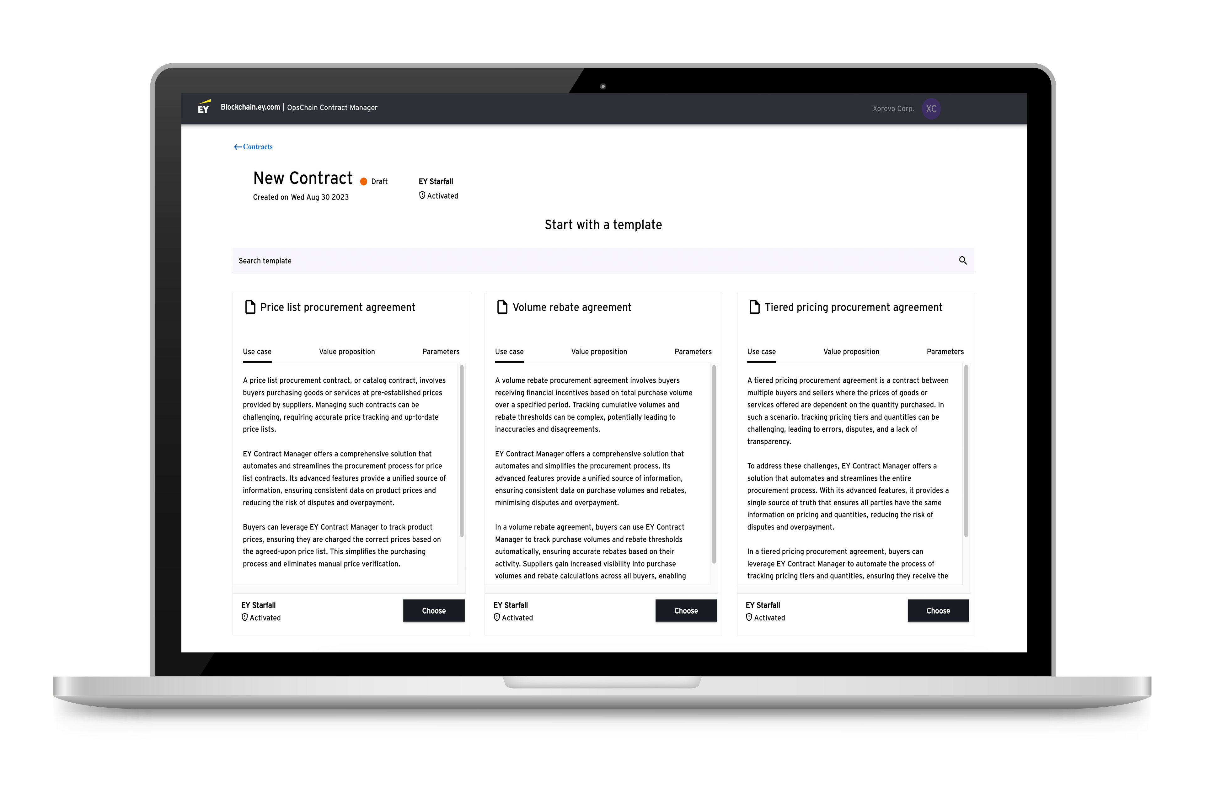 EY OpsChain Contract Manager runs through an API that makes it easy to configure and manage smart contract providers. Firms can set up customized user-interfaces that allow them to configure standard pre-built contracting models. Pre-built models include Power Purchasing for renewables and volume discount models for enterprise procurement. Additional models are currently being developed.