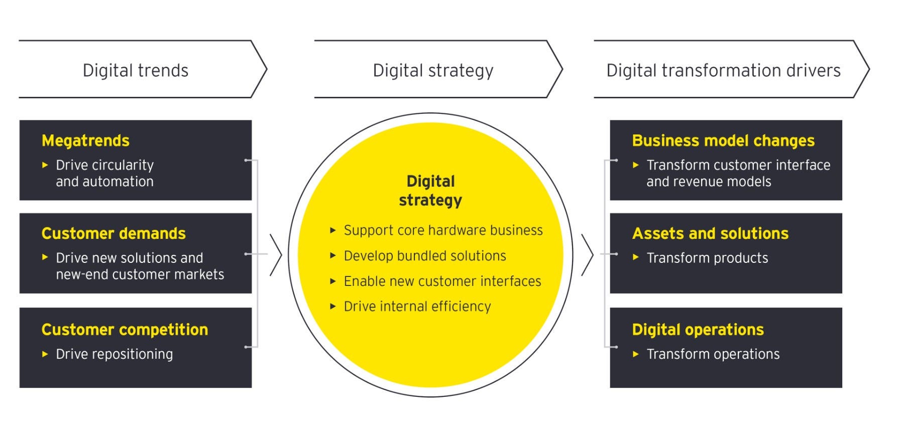For most industrial product companies, the legacy hardware business and its associated aftermarket services make up almost all revenues. It’s therefore crucial to understand how digital and new technologies can protect and grow the hardware sales as well as the often more profitable aftermarket services. This is often done by adding data capabilities to the product portfolio, such as sensors for data collection. A good and well-executed strategy maintains or increases profitability levels, which in turn can finance new digital assets and solutions.