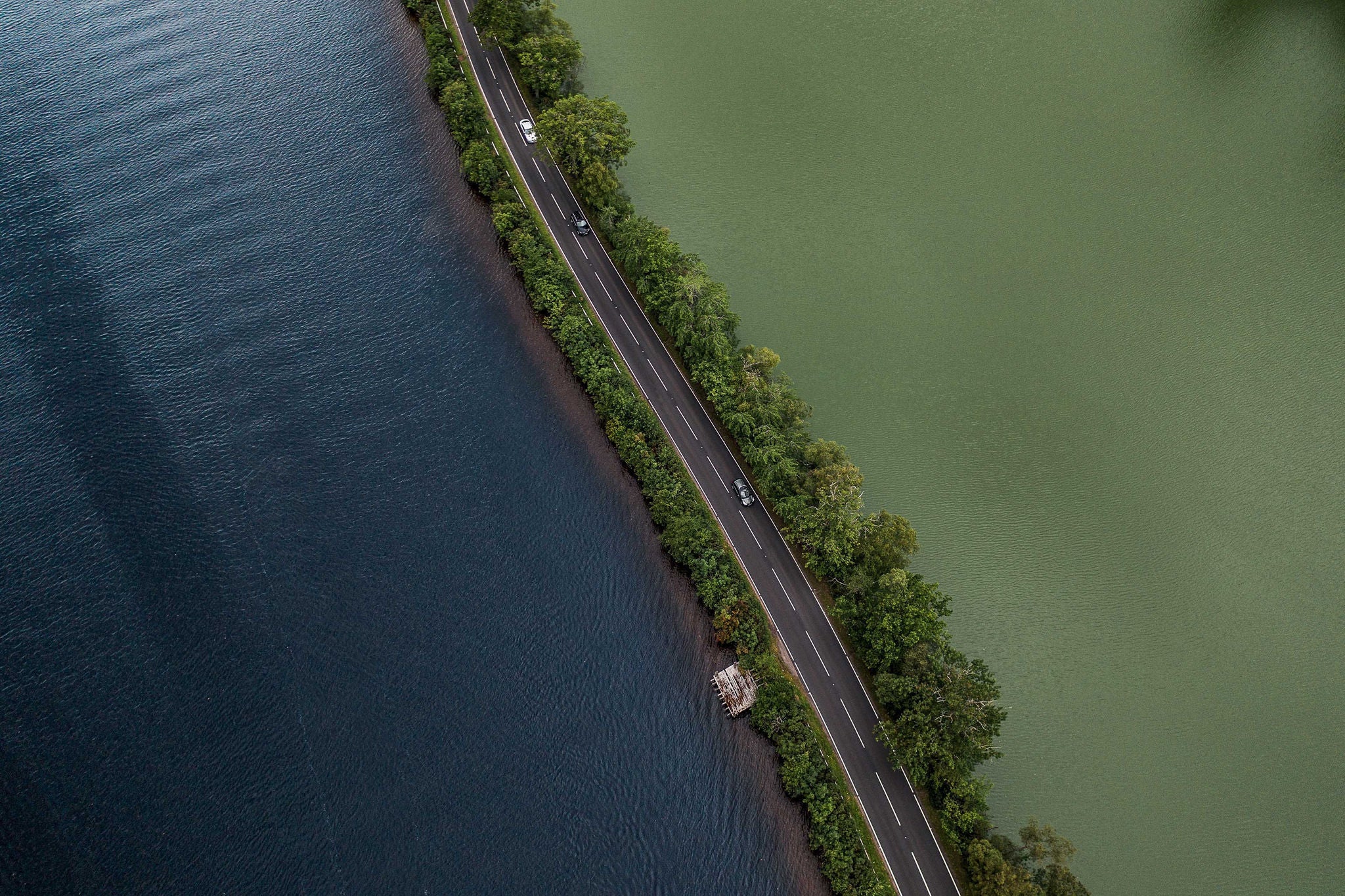 Road crossing two lakes photographed by drone
