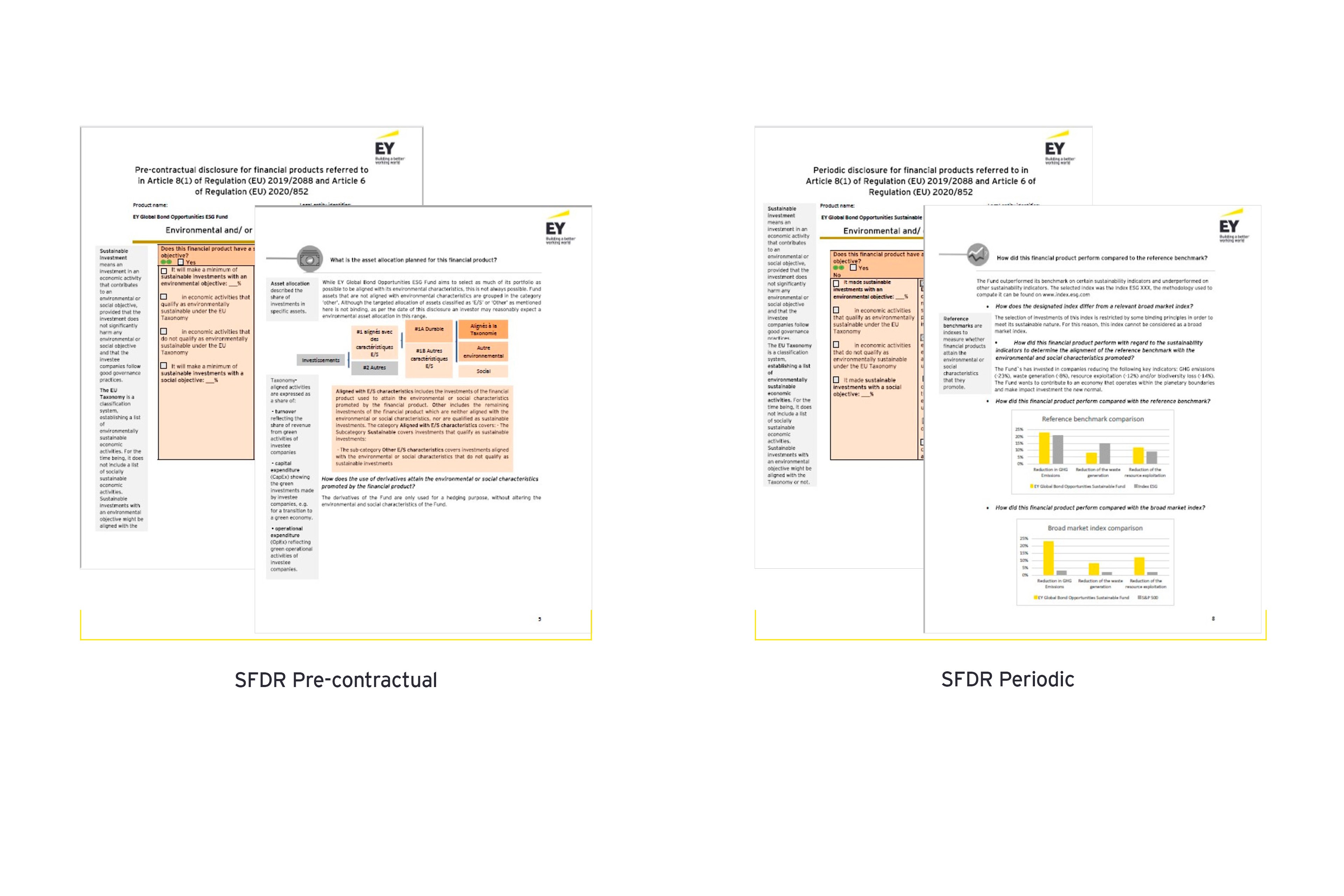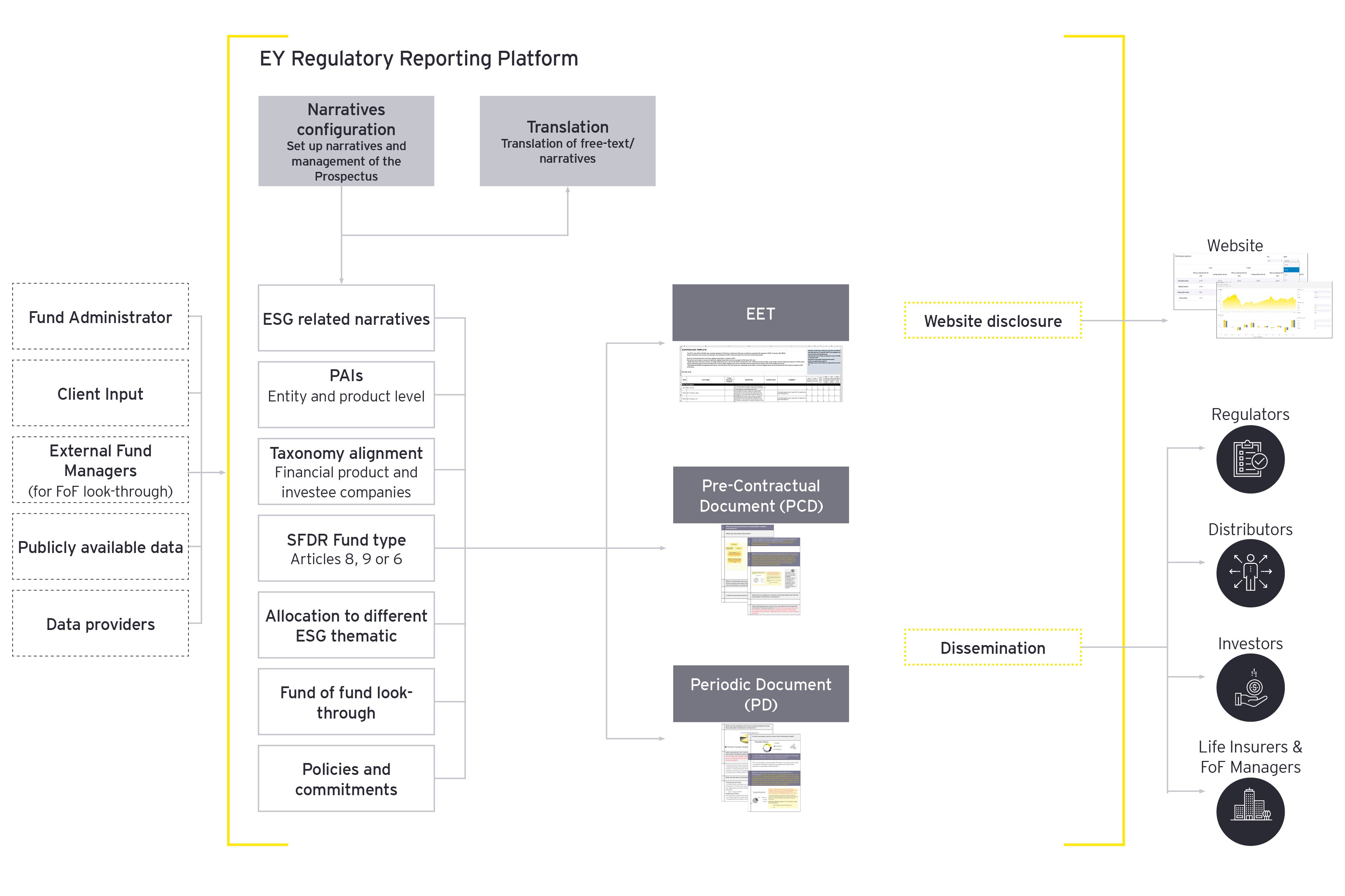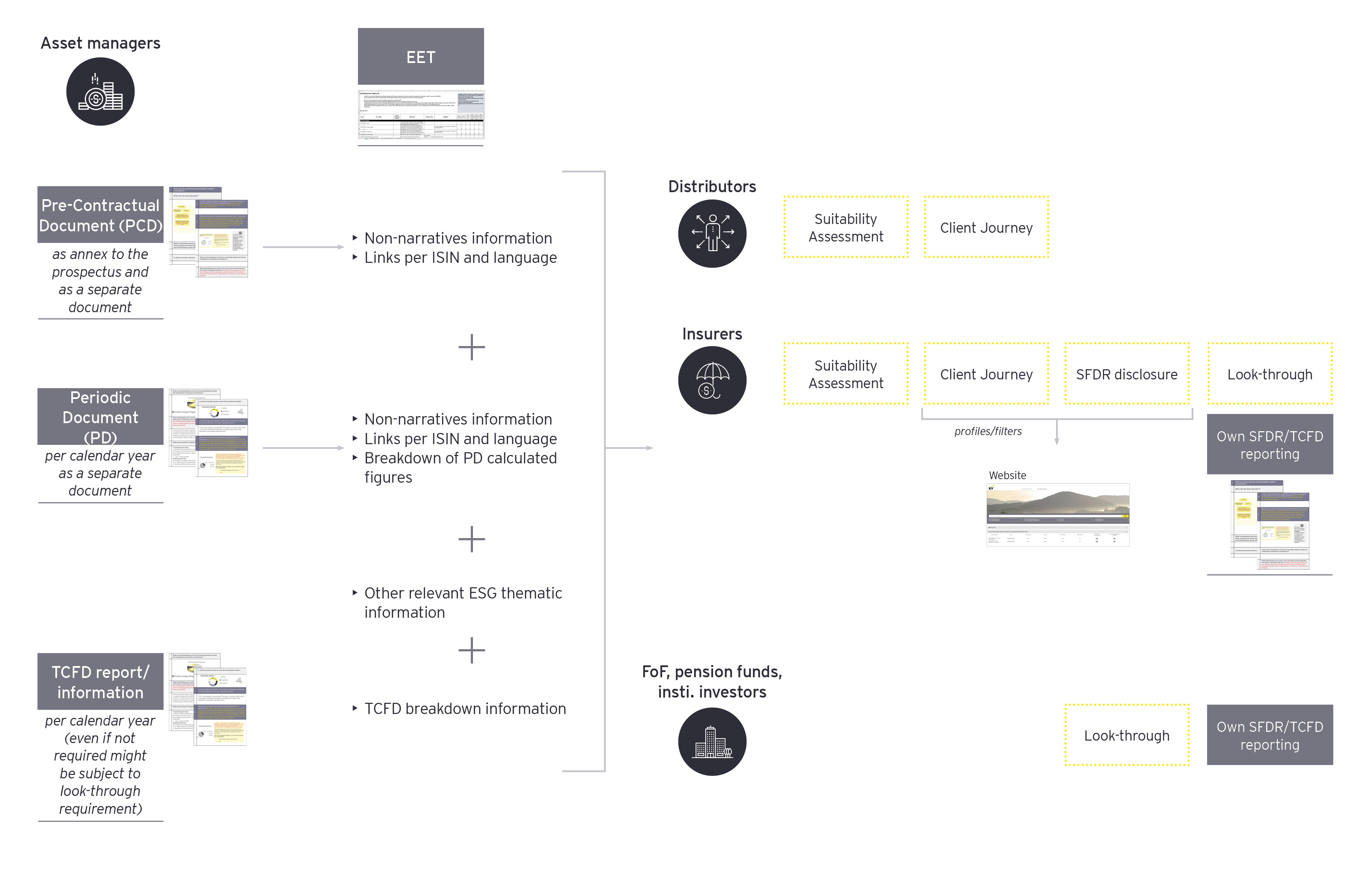 The EET encompasses the necessary content of the PCDs and PDs along with the other relevant ESG, SFDR and EU taxonomy disclosures, as well as the UK TCFD to enable the look-through for fund of funds, pension funds or insurance products for their own disclosure.
