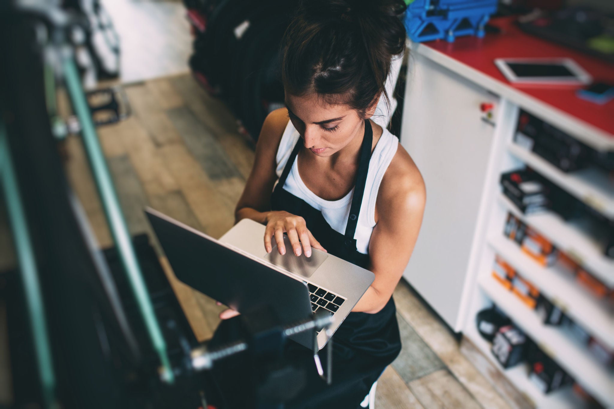 Woman holding a laptop in one hand and operating it with the other