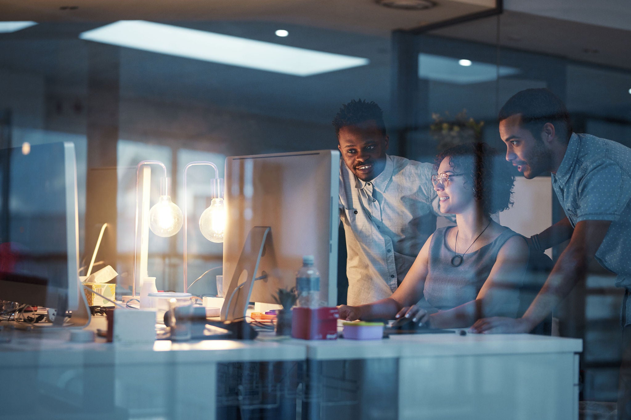 Multi-ethnic coworkers discussing something and sharing ideas in the office.