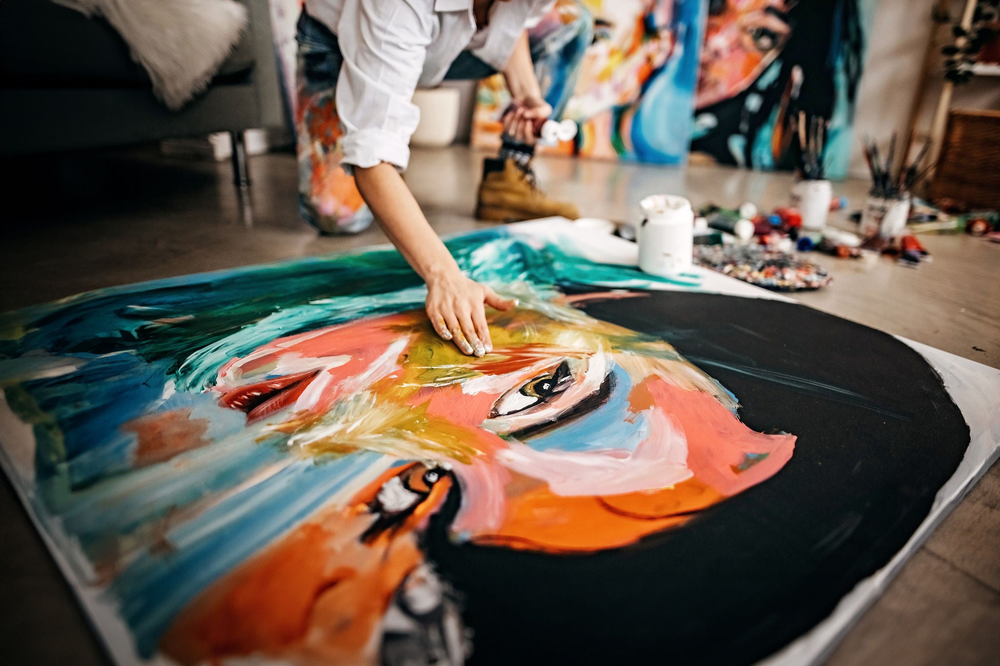 Female artist painting portrait on canvas