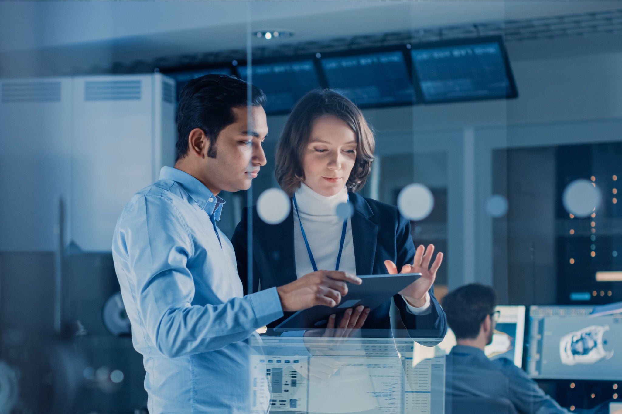 In Technology Research Facility: Female Project Manager Talks With Chief Engineer, they Consult Tablet Computer. Team of Industrial Engineers, Developers Work on Engine Design Using Computers